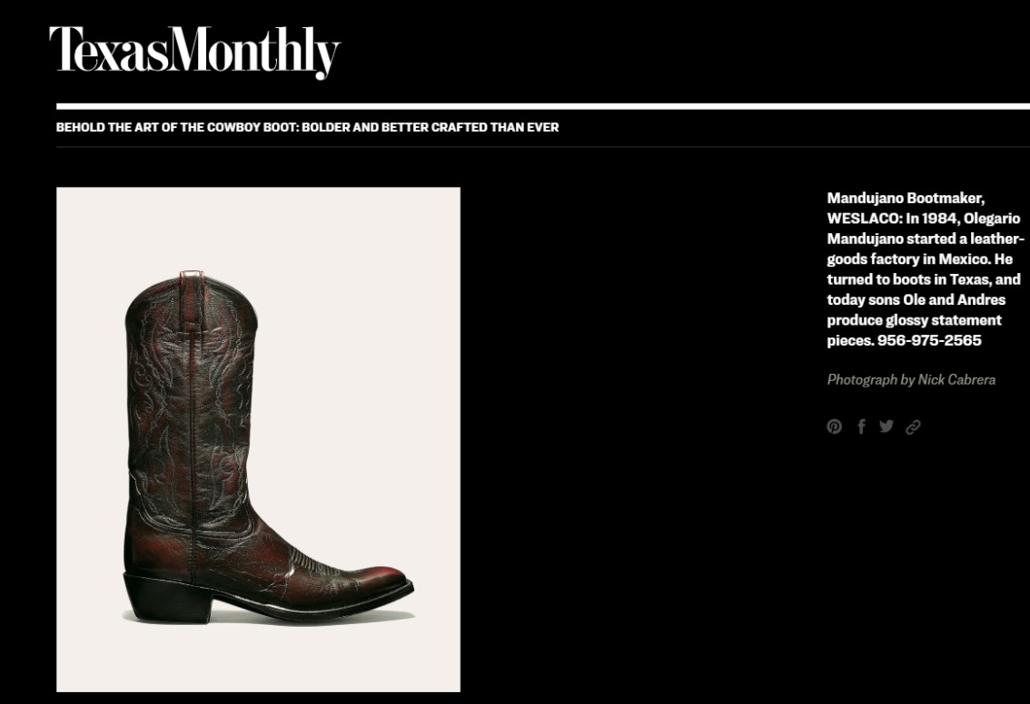 Mandujano Bootmaker is featured in Texas Monthly December edition. Andres and Olegario Mandujano II are added as the new master bootmakers of Texas.