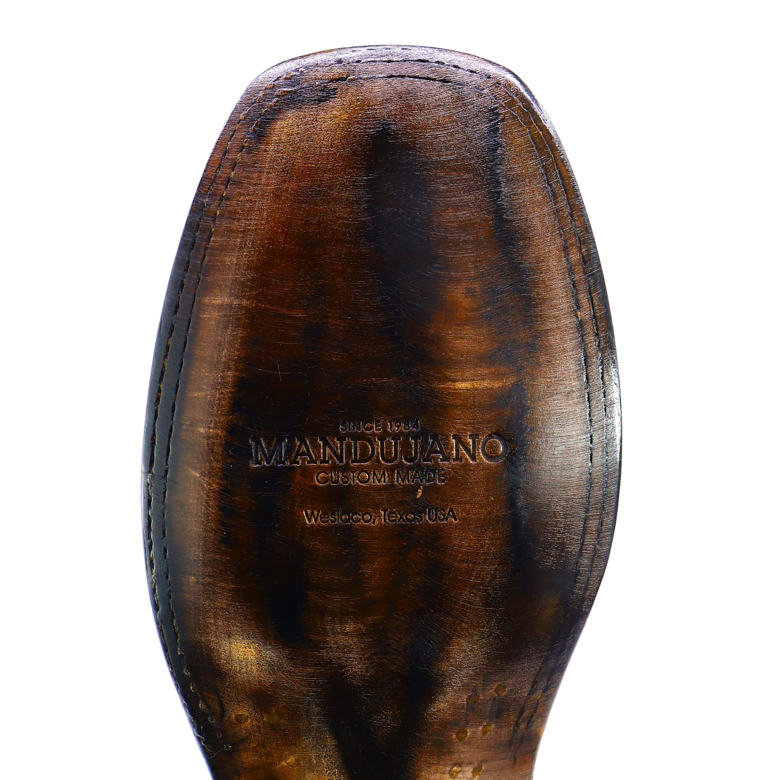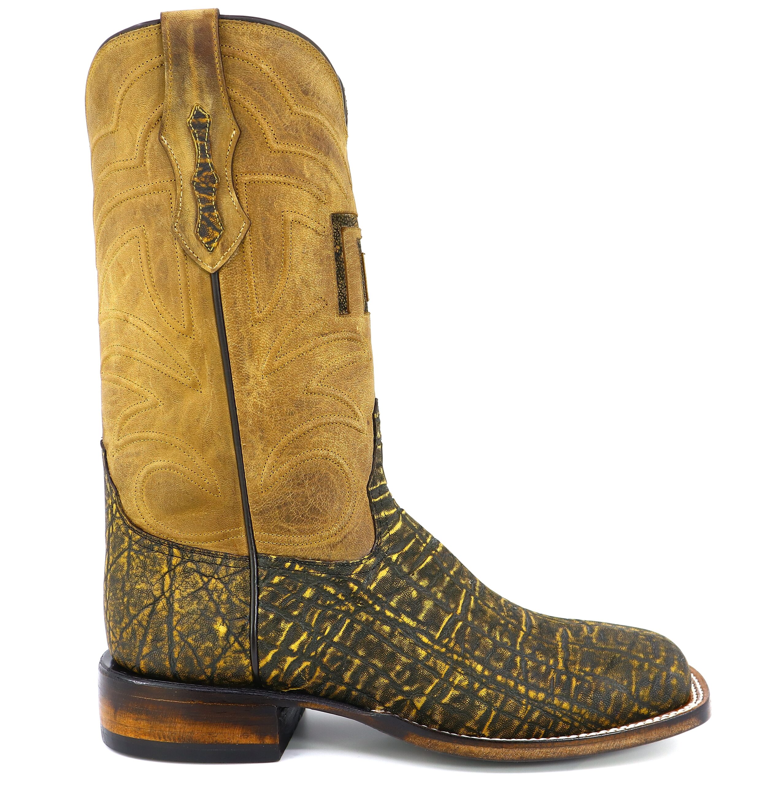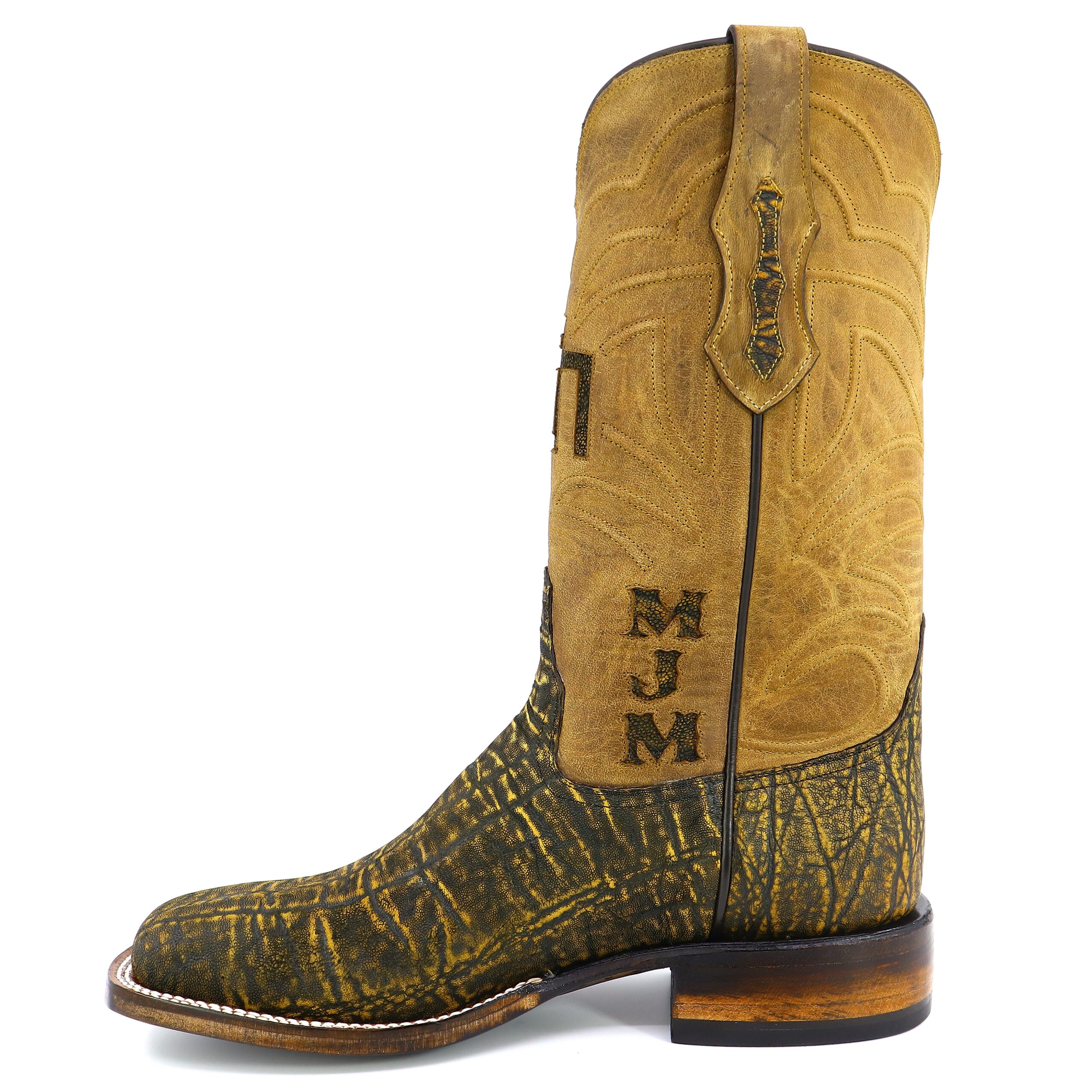 This 13in top boot is constructed from Safari Elephant hide, offering a bold texture and unmatched durability. The shaft features exotic initials “M J M,” and well-centered monogram for a personalized touch. Hand-driven cording designs and exotic outlay pull straps. Classic double stitch square toe and a roper heel for all-day comfort and timeless western attitude. Due to the authentic nature of Elephant skin, shape and markings will vary, making each boot completely unique and unlike any other. Double stitched welt construction. Imported soles. Proudly Custom Handmade in Weslaco, Texas.