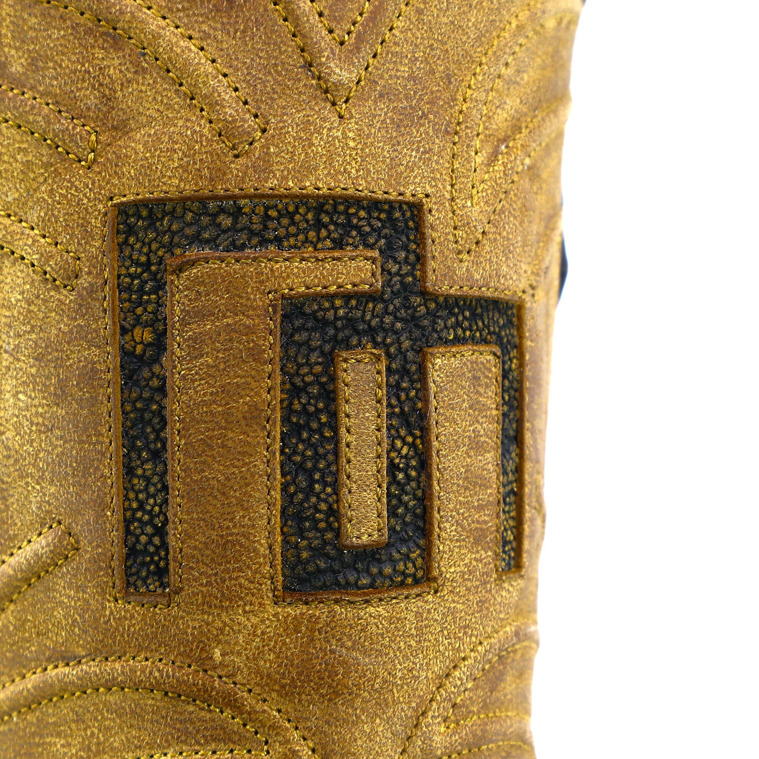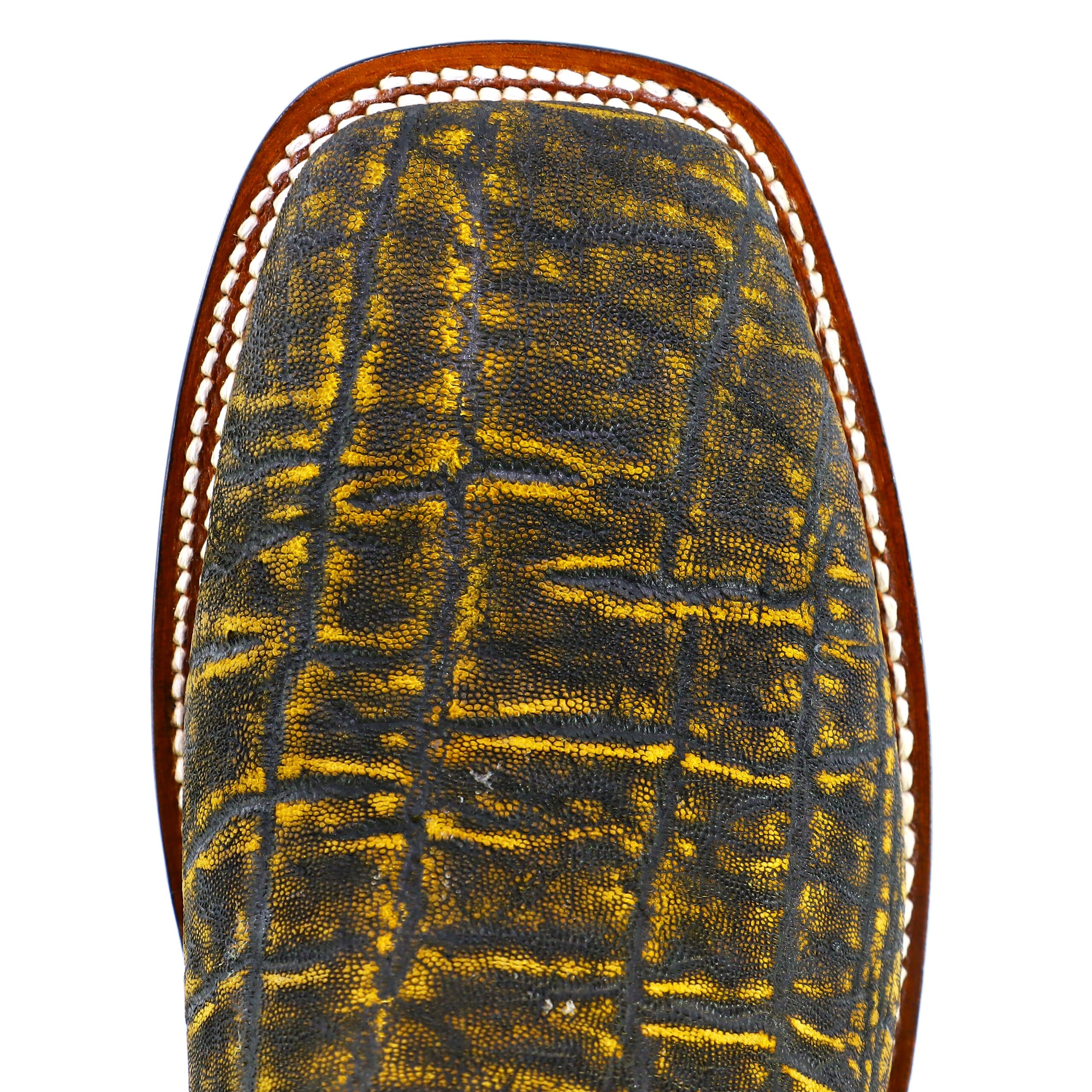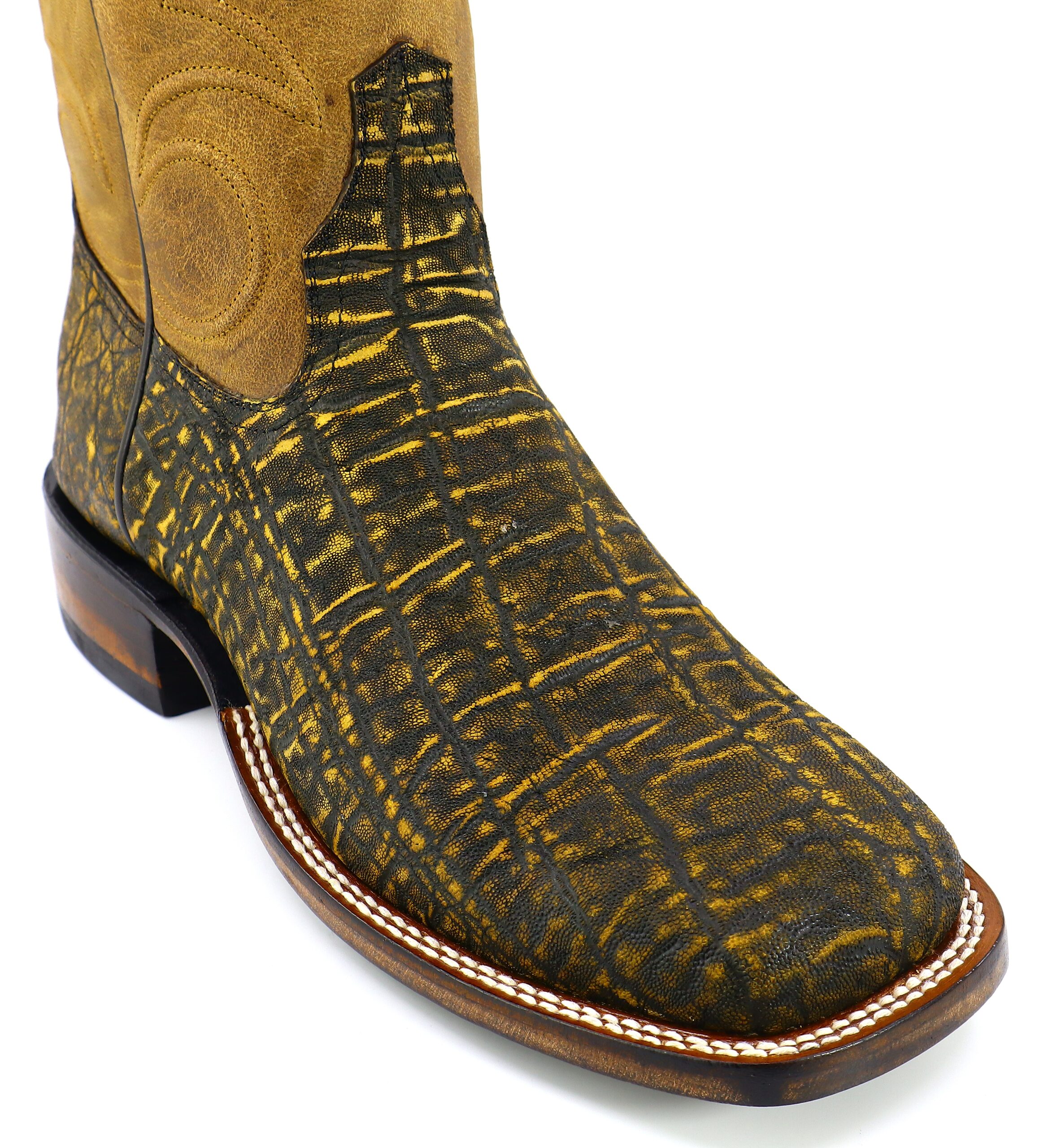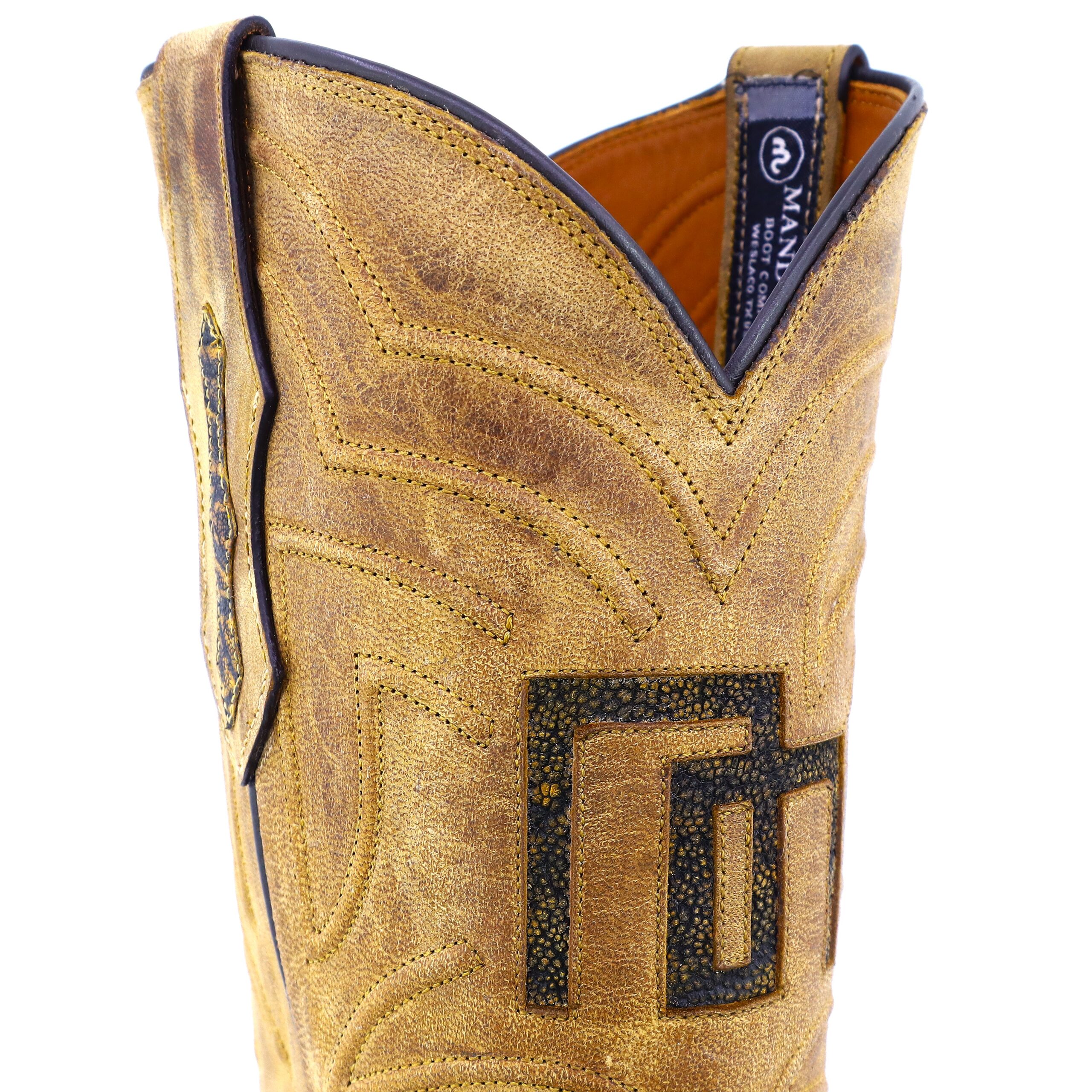 This 13in top boot is constructed from Safari Elephant hide, offering a bold texture and unmatched durability. The shaft features exotic initials “M J M,” and well-centered monogram for a personalized touch. Hand-driven cording designs and exotic outlay pull straps. Classic double stitch square toe and a roper heel for all-day comfort and timeless western attitude. Due to the authentic nature of Elephant skin, shape and markings will vary, making each boot completely unique and unlike any other. Double stitched welt construction. Imported soles. Proudly Custom Handmade in Weslaco, Texas.