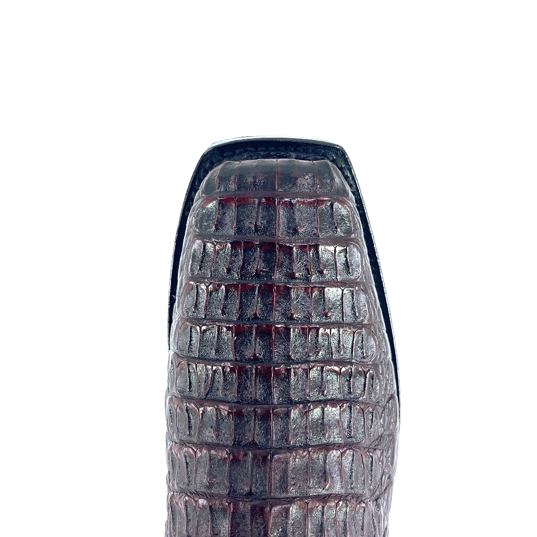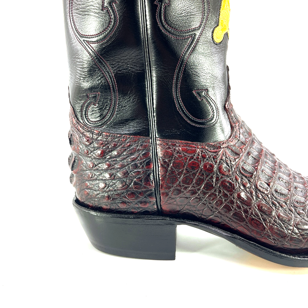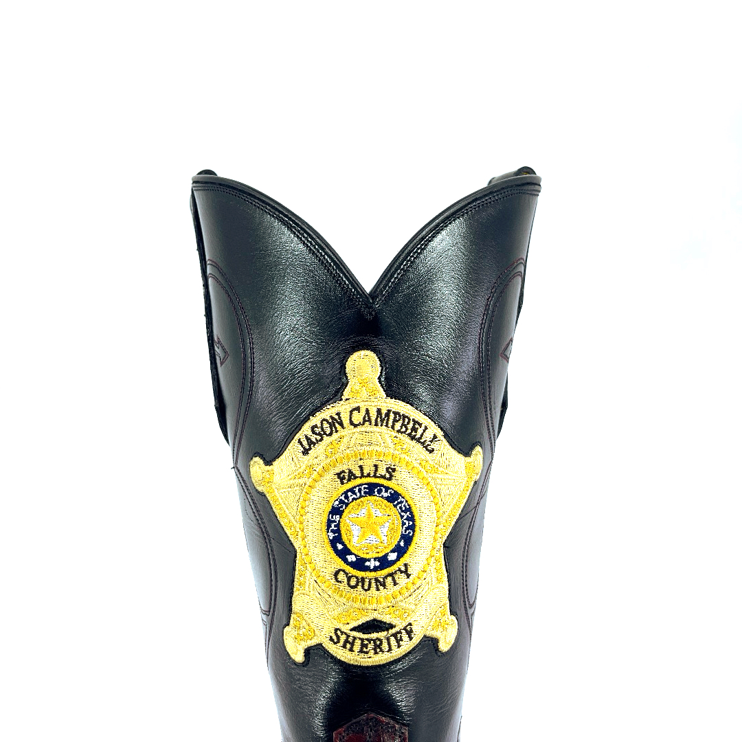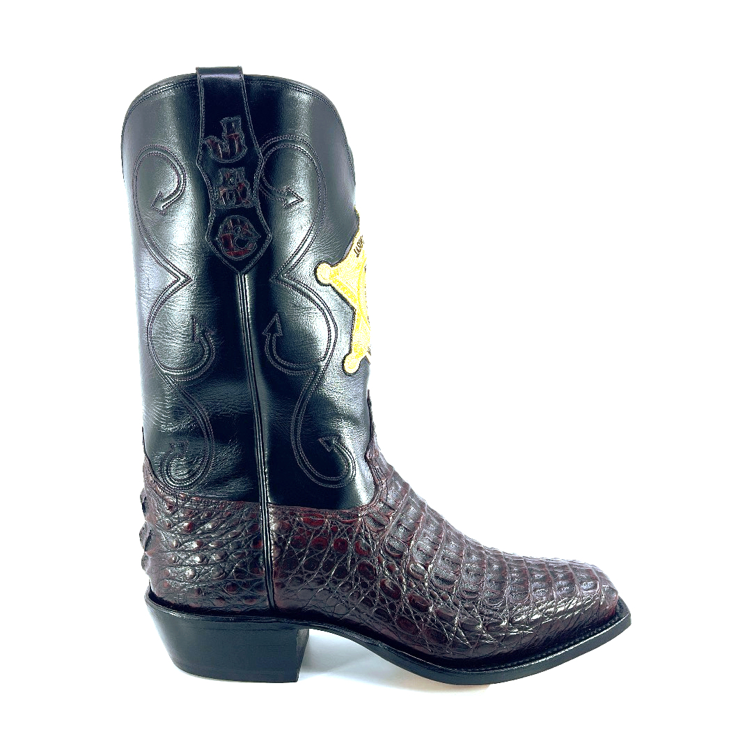 Sitting 13’inch tall, with a timeless classic finish and a high gloss shine, this South American Caiman Hornback boot is complimented with a comfortable walking heel and a traditional square toe. The shaft is constructed with Grade A Premium Goat skin and features a well centered law enforcement badge, a stitching design and outlay pull straps. The premium cushioned insole offers lasting comfort and support and its single stitched welt construction around the leather outsole guarantees durability for extended wear. Lemonwood pegging construction. Imported Leather insole and outsole. Proudly custom made and designed in Weslaco, Texas.
