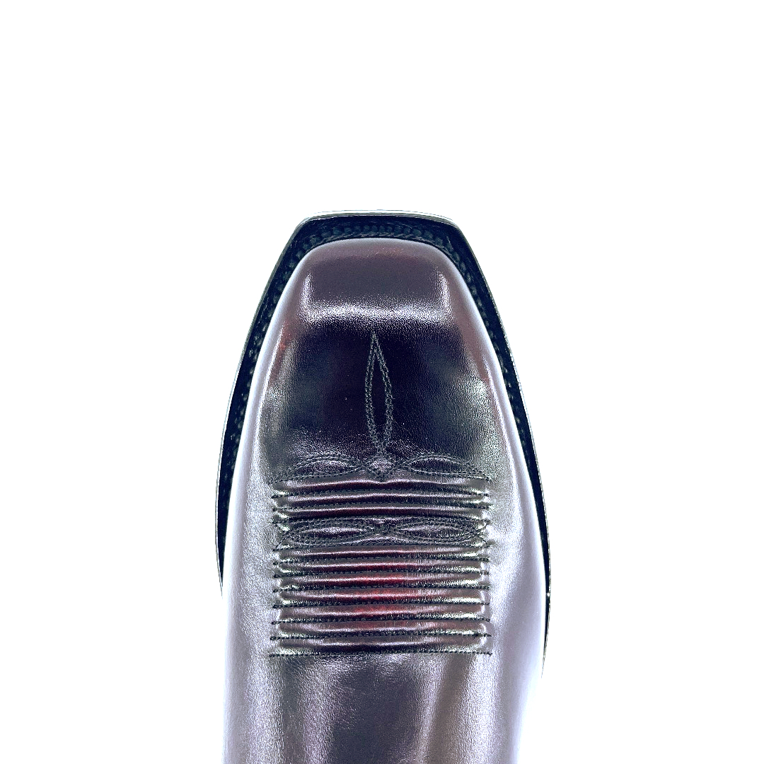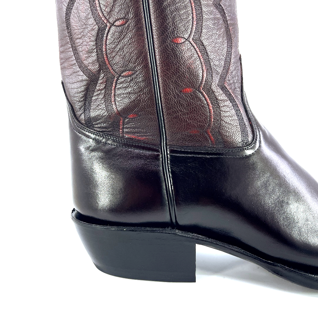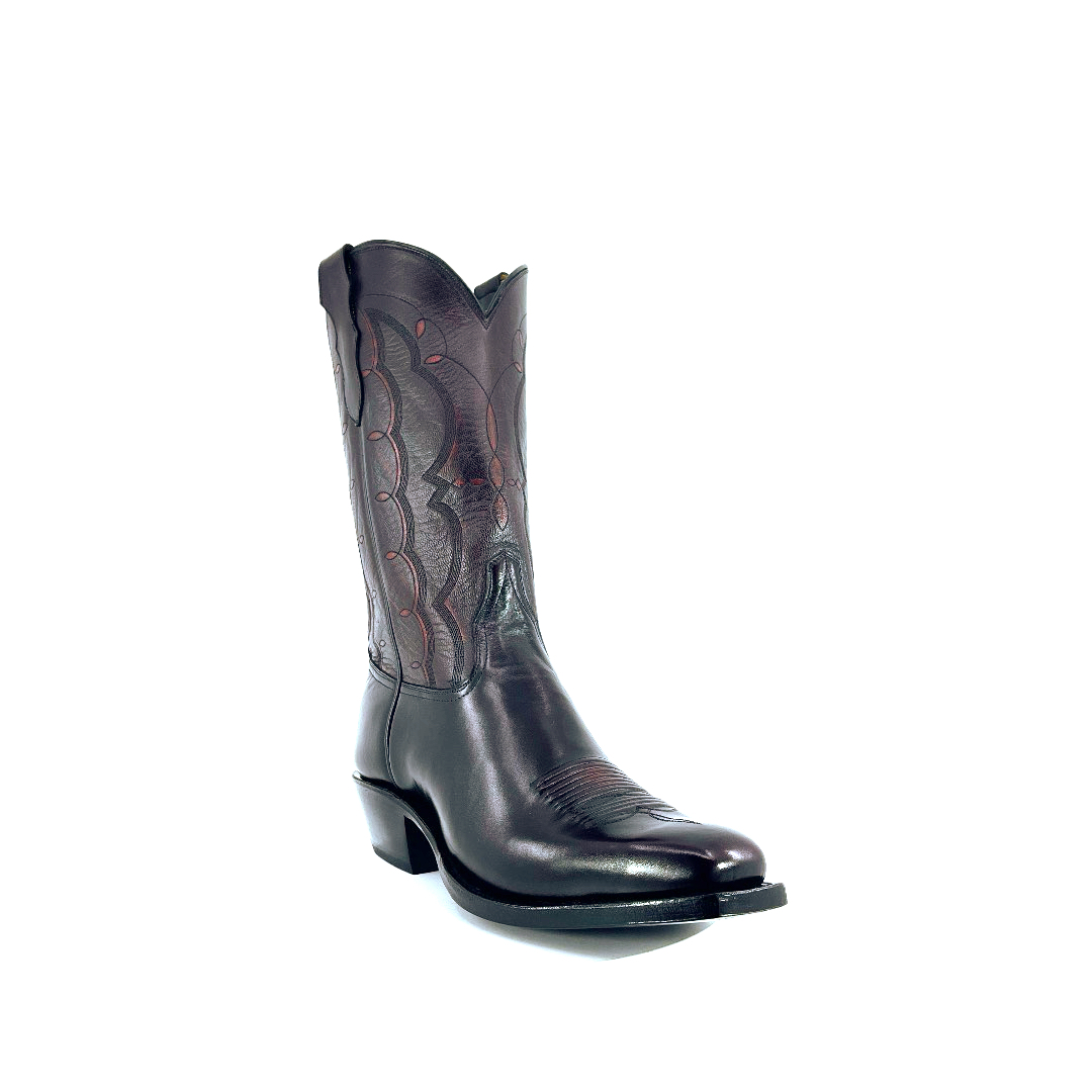 Standing at 13’inch tall, with a timeless classic finish and a high gloss shine. These Black Cherry Indian Goat boots are complimented with a comfortable walking heel and a classic round toe. The shaft is complimented with a 6-stitching design pattern with outlay pull straps. The premium cushioned insole offers lasting comfort and support and its single stitch welt around the leather outsole guarantees durability for extended wear. Lemonwood pegging construction. Imported Leather insole and outsole. Proudly custom made and designed in Weslaco, Texas.
