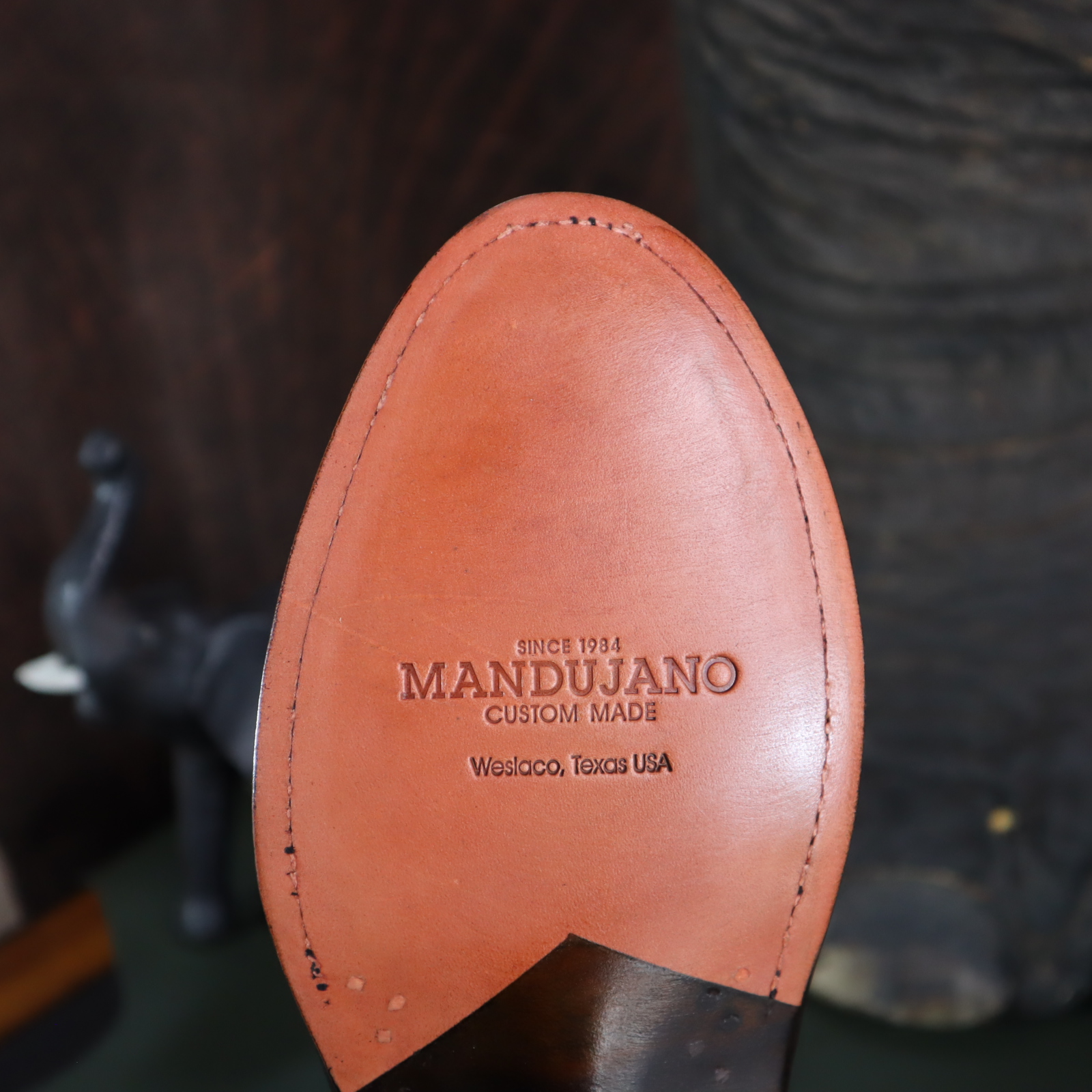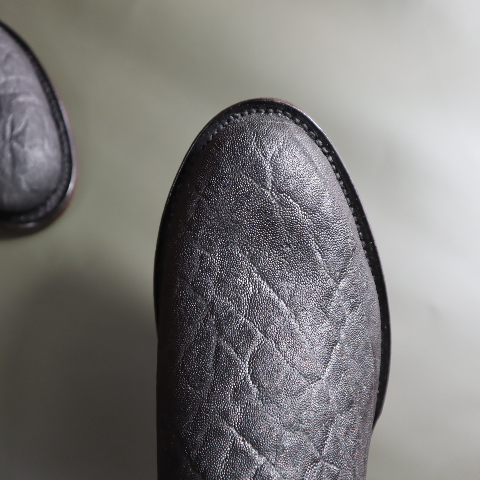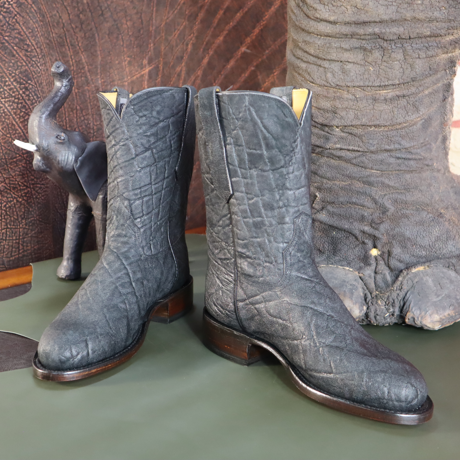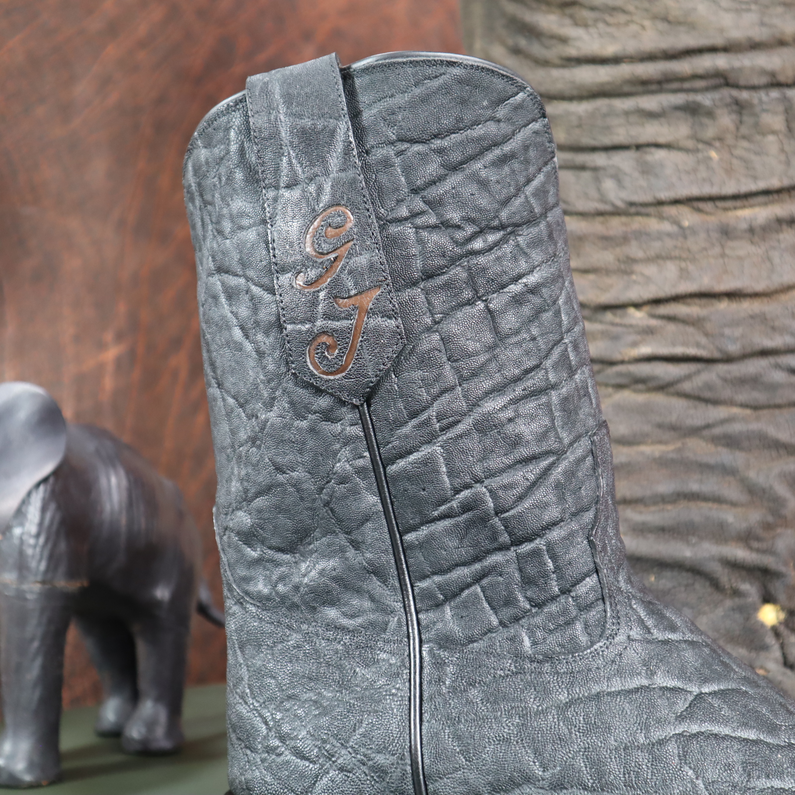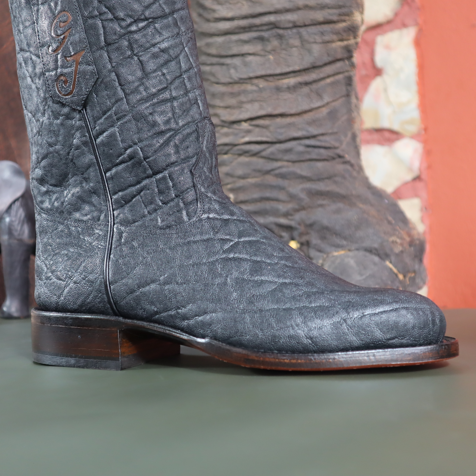 This 13in top boot is constructed from a customer-harvested exotic Safari Elephant leather. This custom roper boot is crafted entirely from Safari Elephant hide, offering a bold texture and unmatched durability. The shaft features exotic outlay pull straps with custom initials for a personalized touch. Classic round toe and a flat roper heel for all-day comfort and timeless western attitude. Due to the authentic nature of Elephant skin, shape and markings will vary, making each boot completely unique and unlike any other. Single stitched welt and lemonwood pegging construction. Imported leather soles. Proudly Custom Handmade in Weslaco, Texas.
