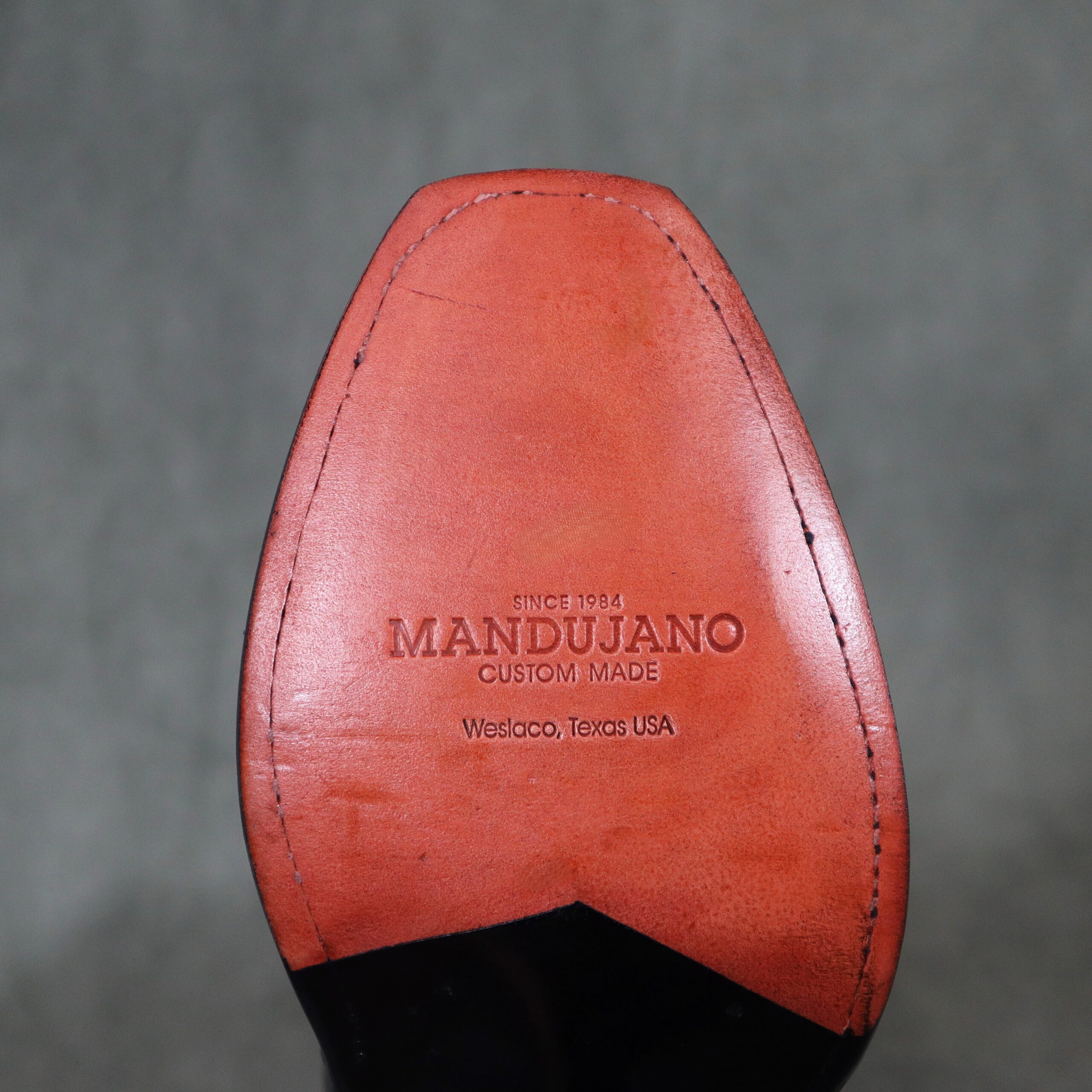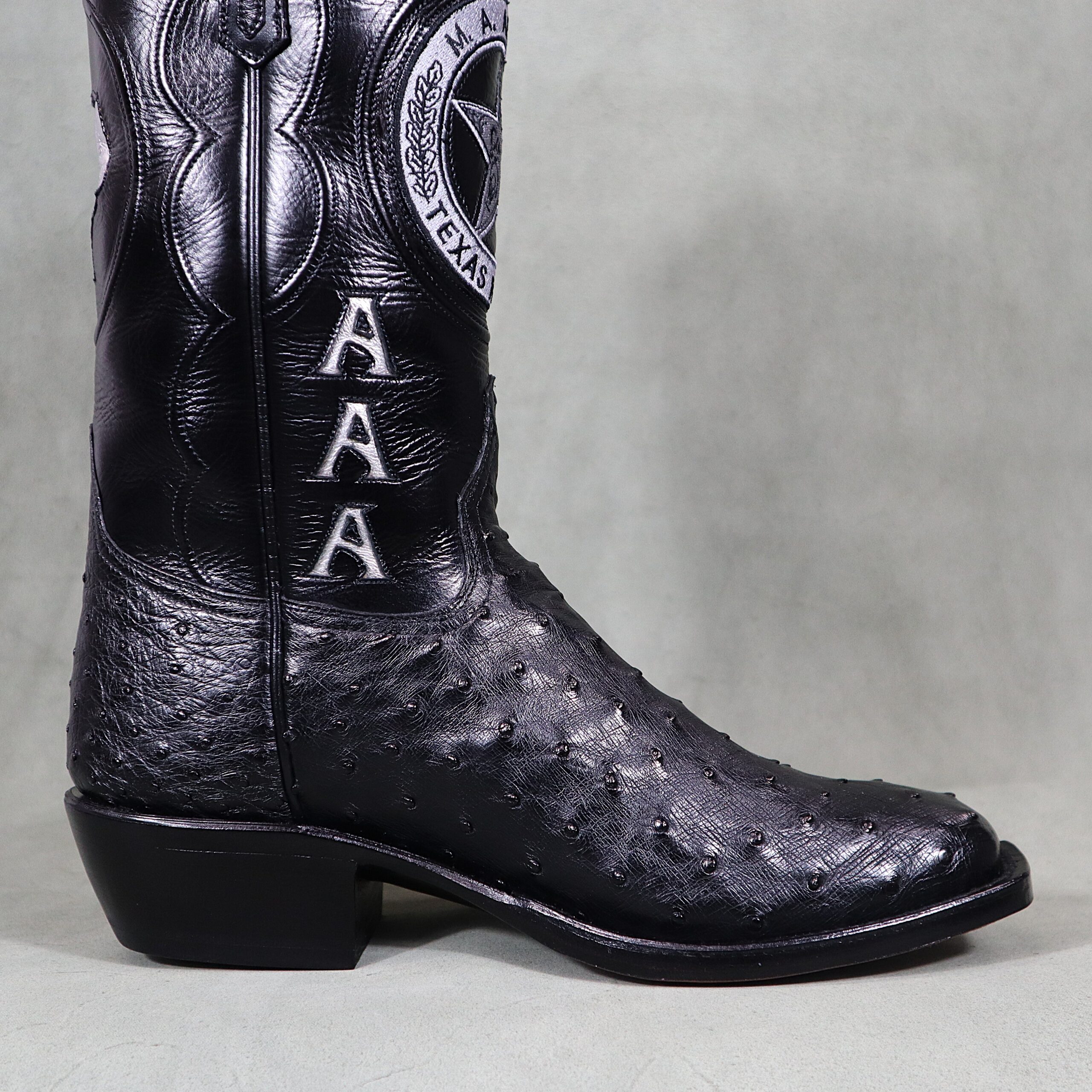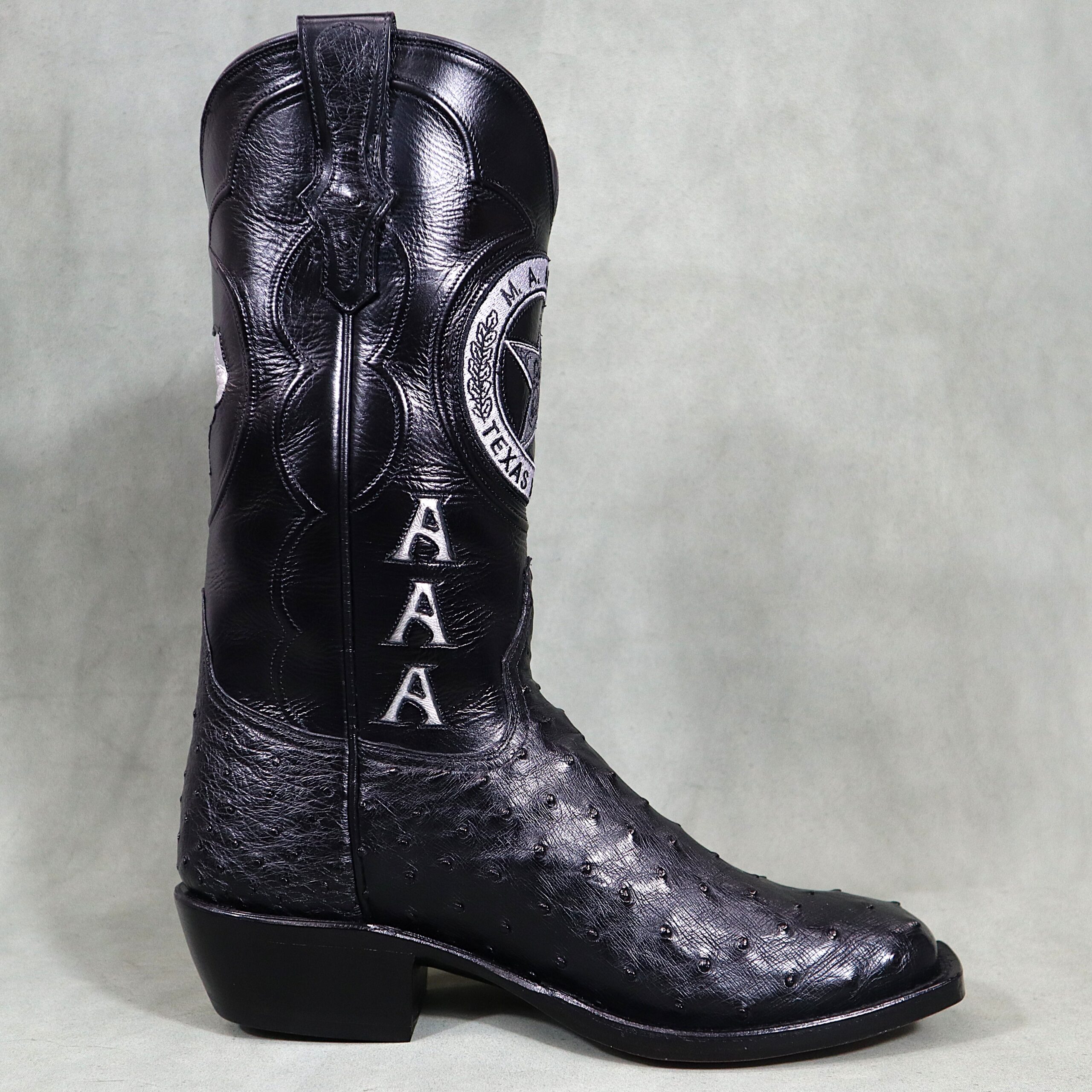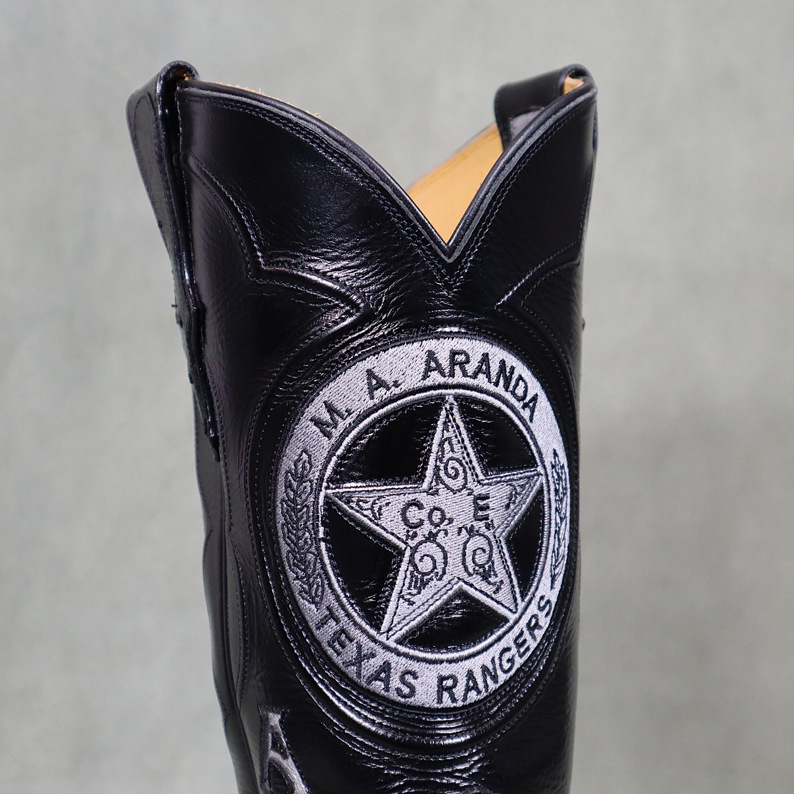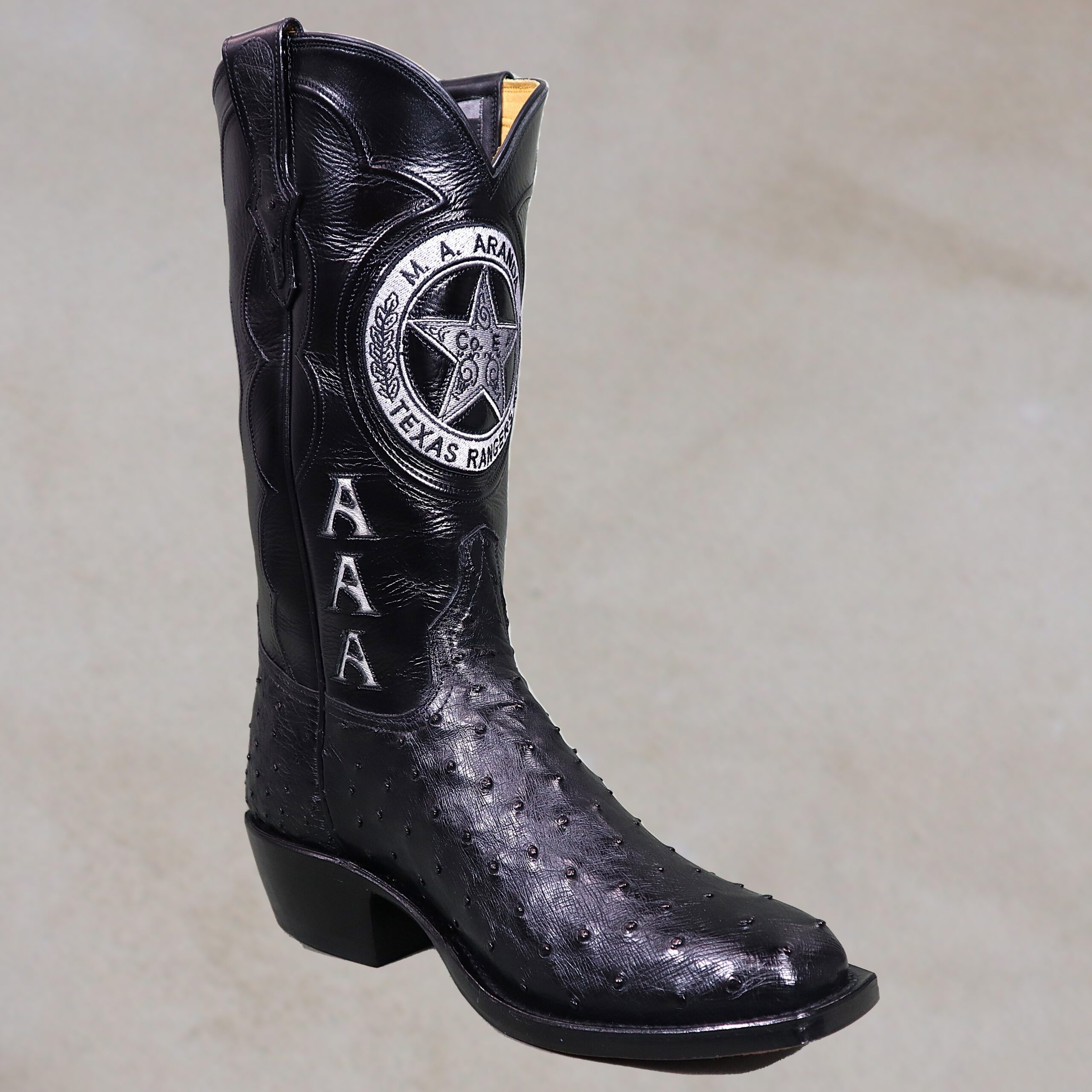 This pair offers a distinctive and luxurious feel. This boot stands 13″ tall and is constructed with one of our softest skins, Zimbabwe Full Quill Ostrich. The shaft is constructed with rough-out leather that offers comfort around the calf with hand driven cording design. As well, the shaft features a well-centered Texas Ranger “M. A. Aranda” badge and ” A A A” exotic initials for a personalized touch. Due to the authentic nature of the Ostrich, shape and markings will vary, making each boot completely unique and unlike any other. The premium cushioned insole offers lasting comfort and support. Single stitched welt construction around the leather outsole guarantees durability for extended wear. Lemonwood pegging construction. Imported leather soles. Proudly Custom Handmade in Weslaco, Texas.
