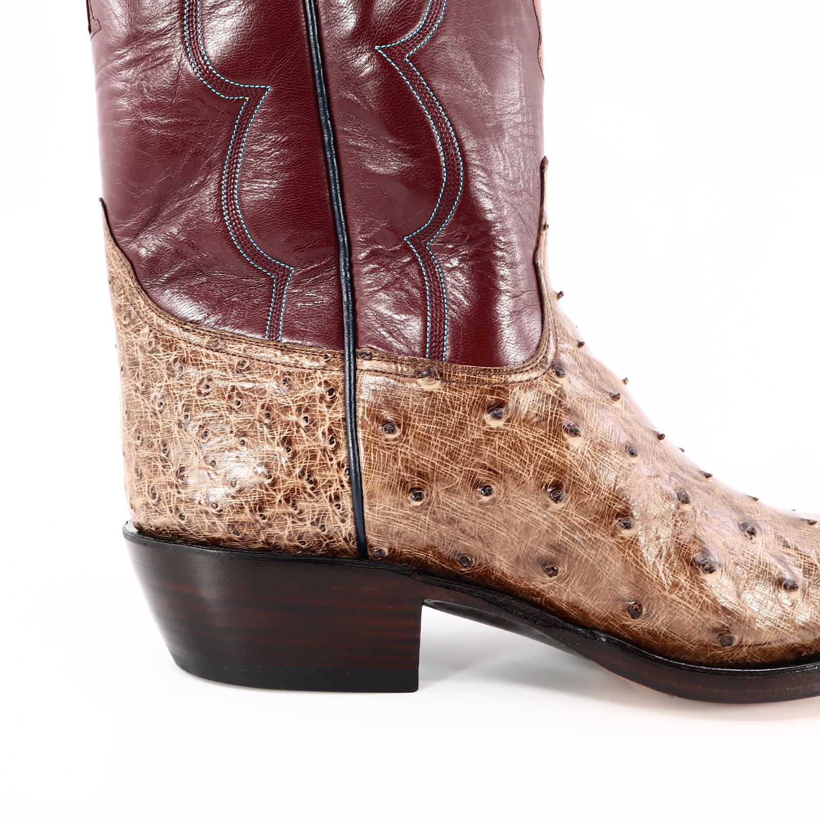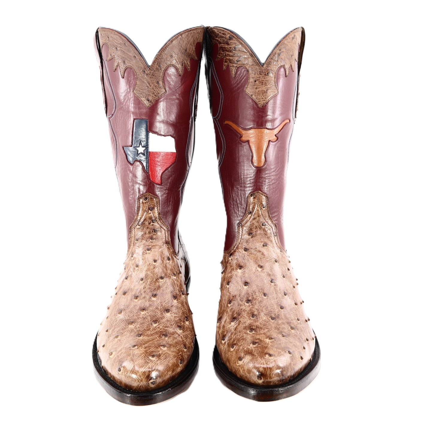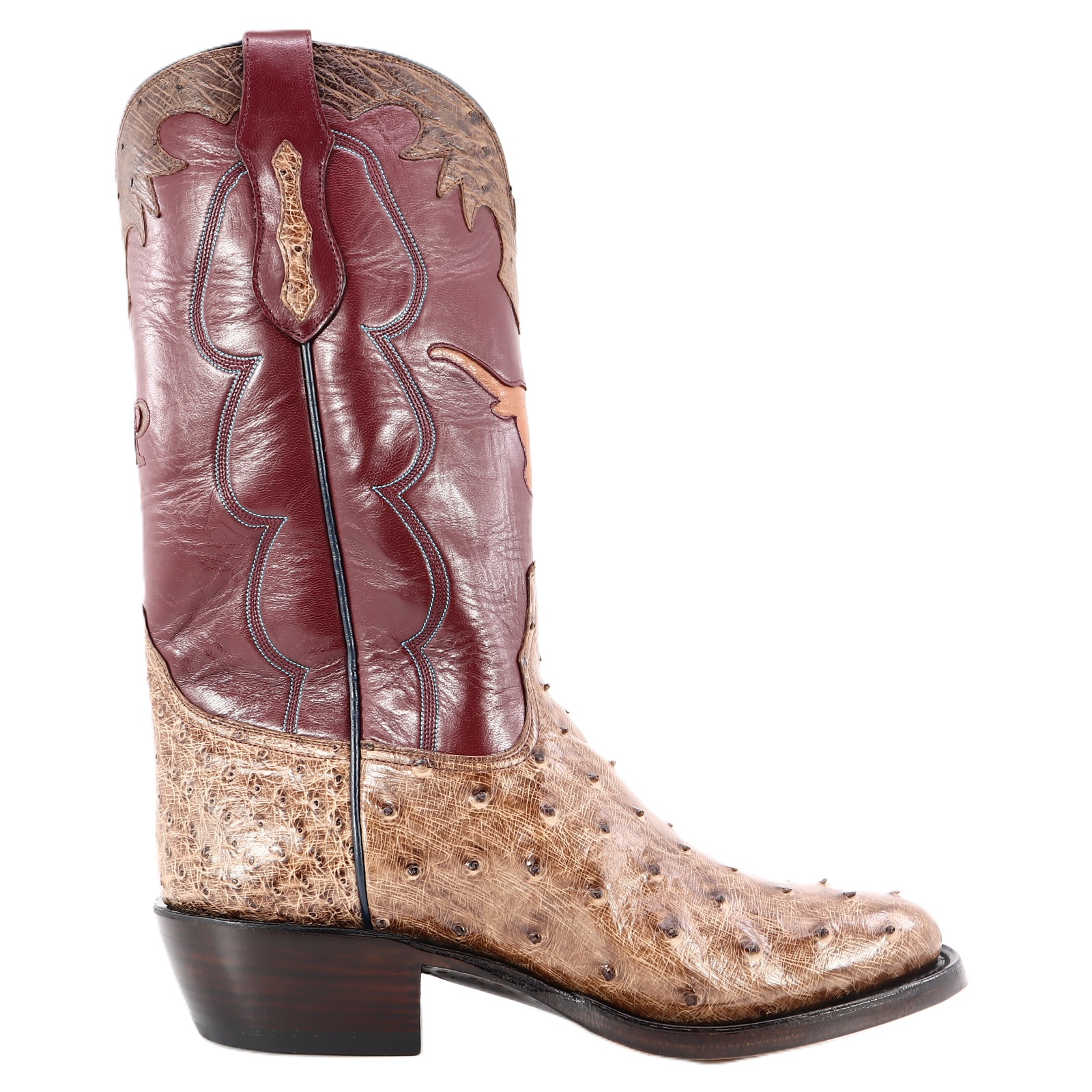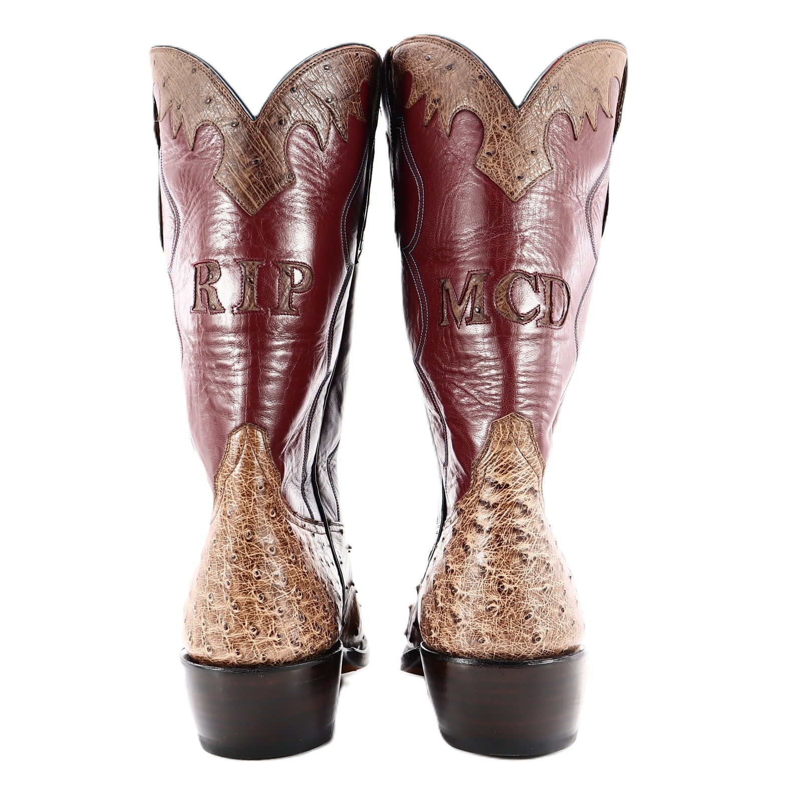 Where durability meets luxury; this boot stands 13″ tall and is constructed with one of our softest skins, Zimbabwe Full Quill Ostrich. This pair offers a distinctive and luxurious feel. The shaft is constructed with rough-out leather that offers comfort around the calf. As well, the shaft features a well centered Texas Map and Longhorns monogram. As well, the shaft features well-centered exotic initials “RIP and MCD,” exotic outlay pull straps and collars. Due to the authentic nature of the Ostrich, shape and markings will vary, making each boot completely unique and unlike any other. The premium cushioned insole offers lasting comfort and support. Single stitched welt construction around the leather outsole guarantees durability for extended wear. Lemonwood pegging construction. Imported leather soles. Proudly Custom Handmade in Weslaco, Texas.