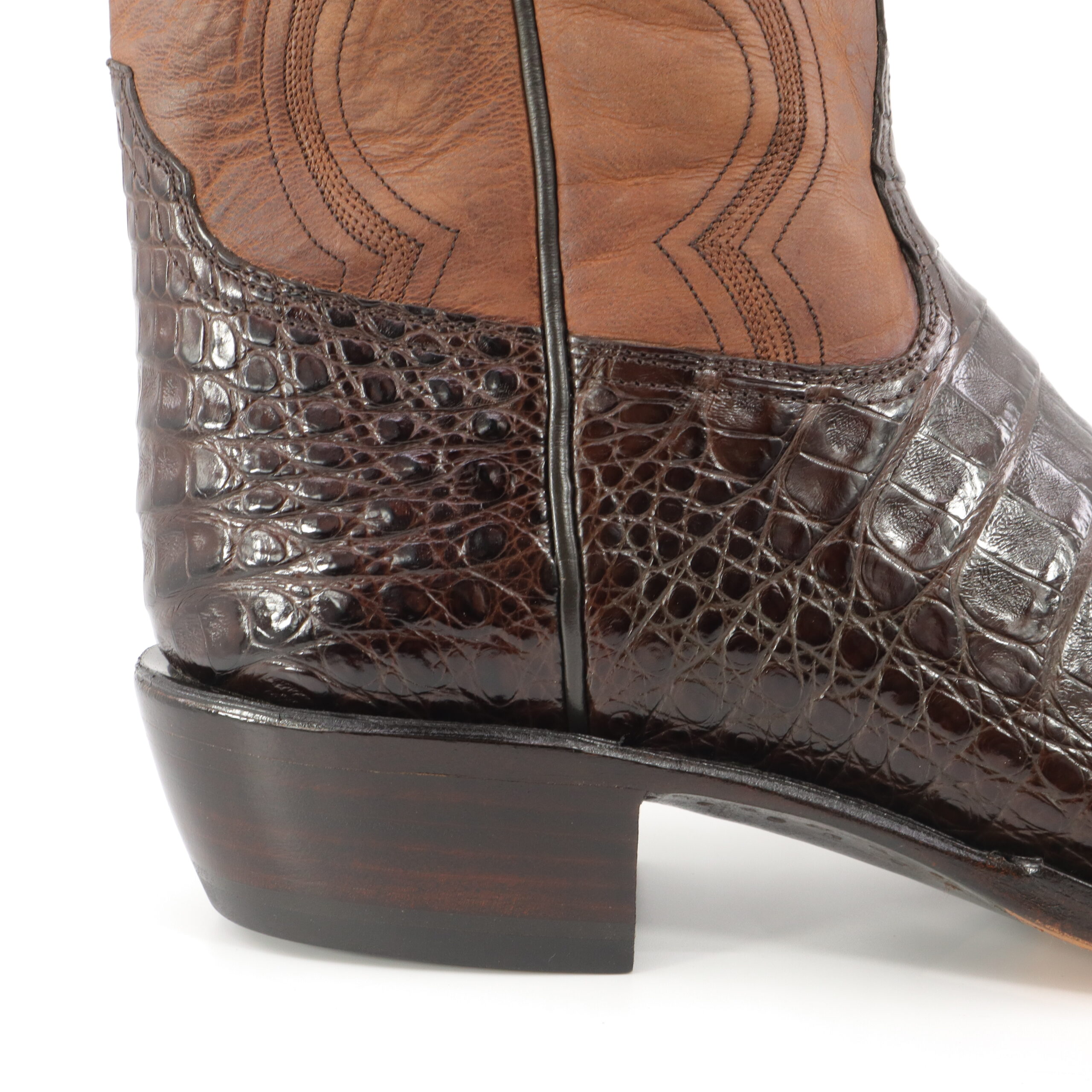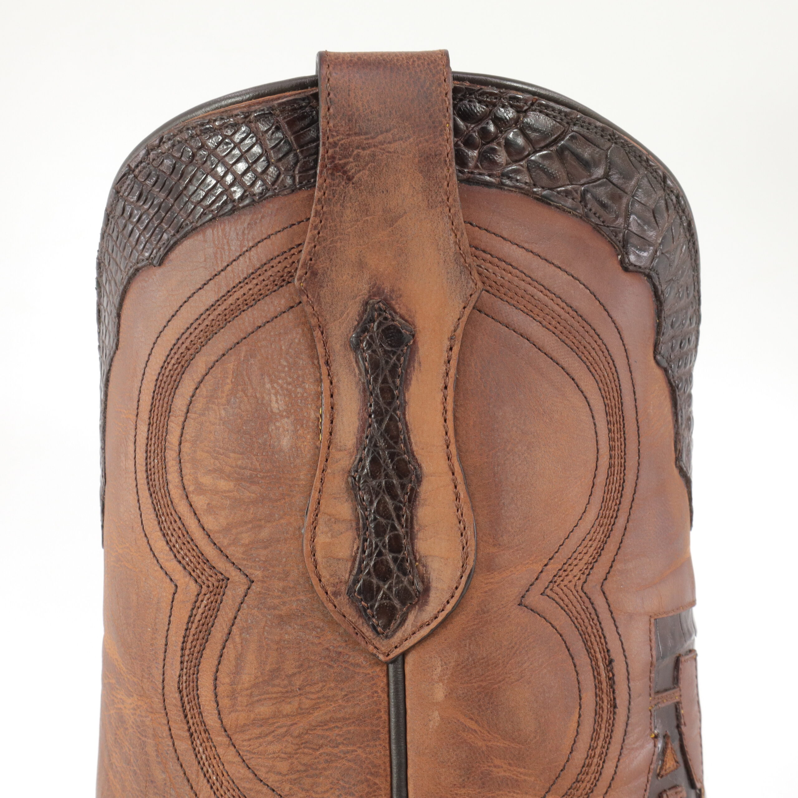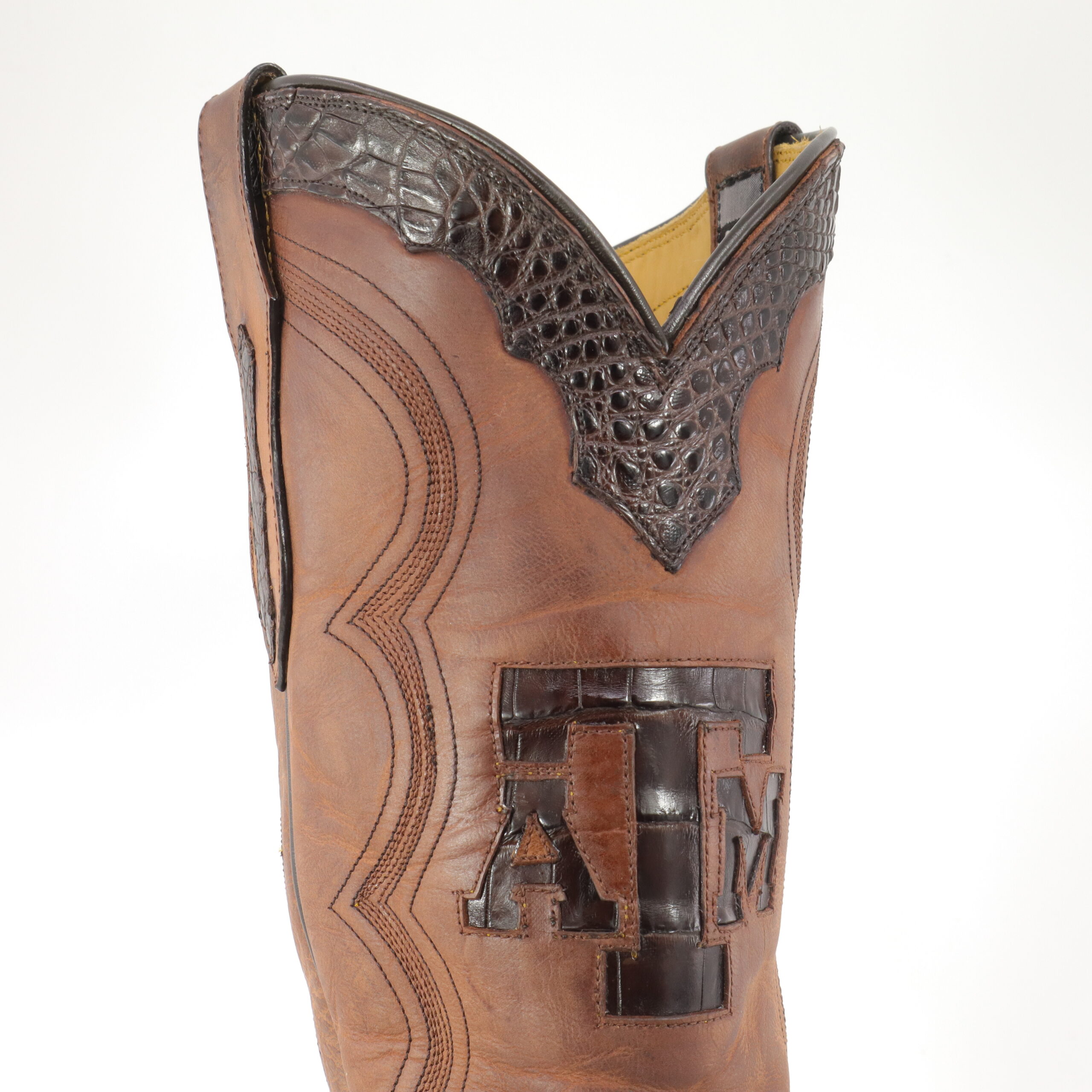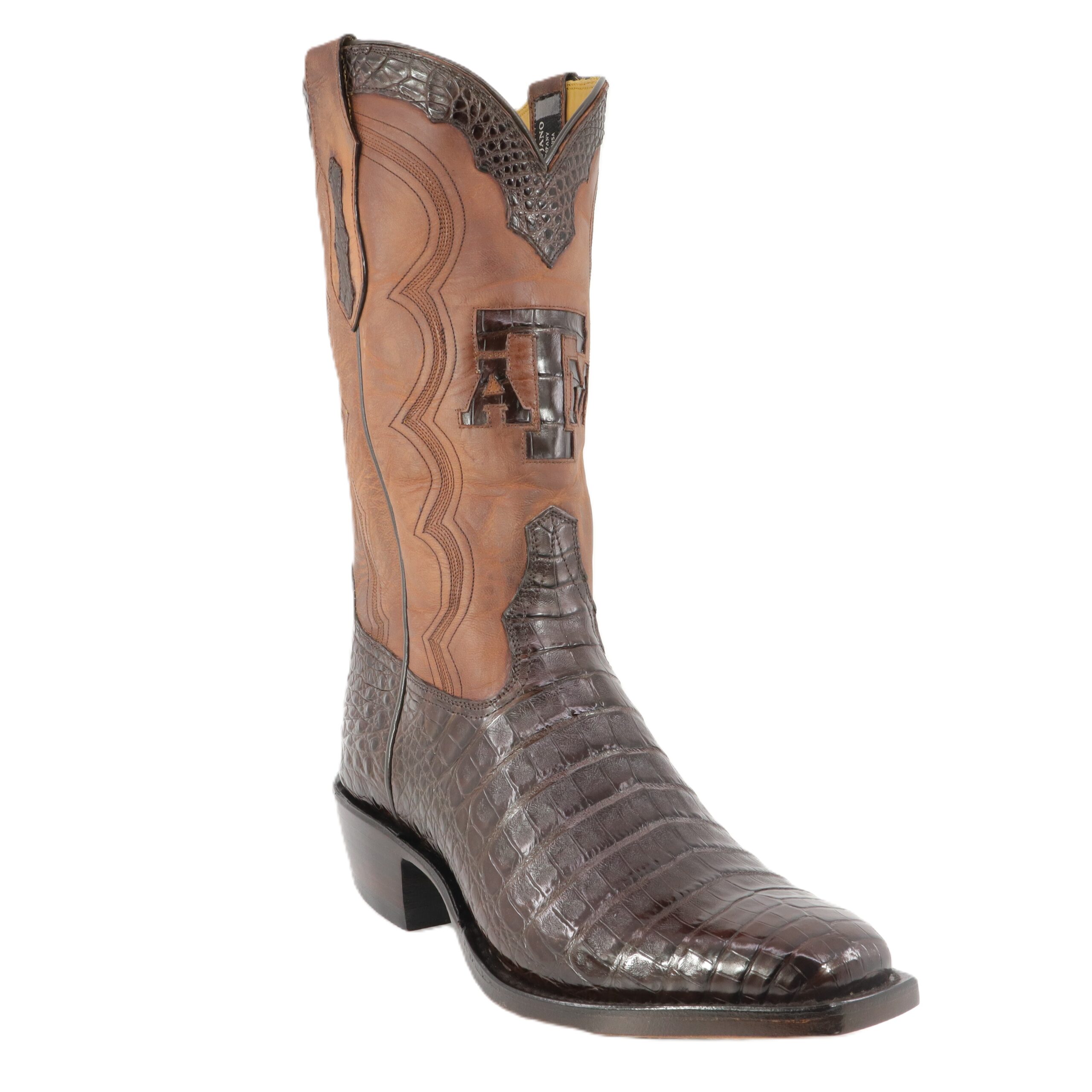 Step into timeless craftsmanship with this custom made, Caiman Belly boot. This pair showcases the bold, natural scale pattern that makes caiman belly exotic and distinctive. The shaft is complimented with the iconic Texas “ATM” monogram, and is stitched with precision to showcase heritage, loyalty and tradition. The shaft is constructed from Grade A Premium Goat skin and features a 6-row stitching design and exotic collars and pull straps. The premium cushioned insole offers lasting comfort and support and its single stitched welt construction around the leather outsole guarantees durability for extended wear. Lemonwood pegging construction. Imported Leather insole and outsole. Proudly custom made and designed in Weslaco, Texas.