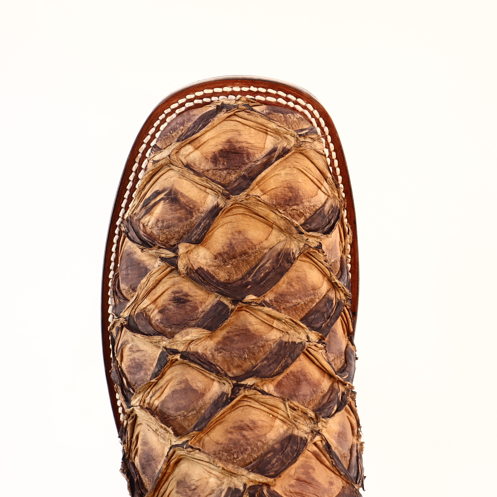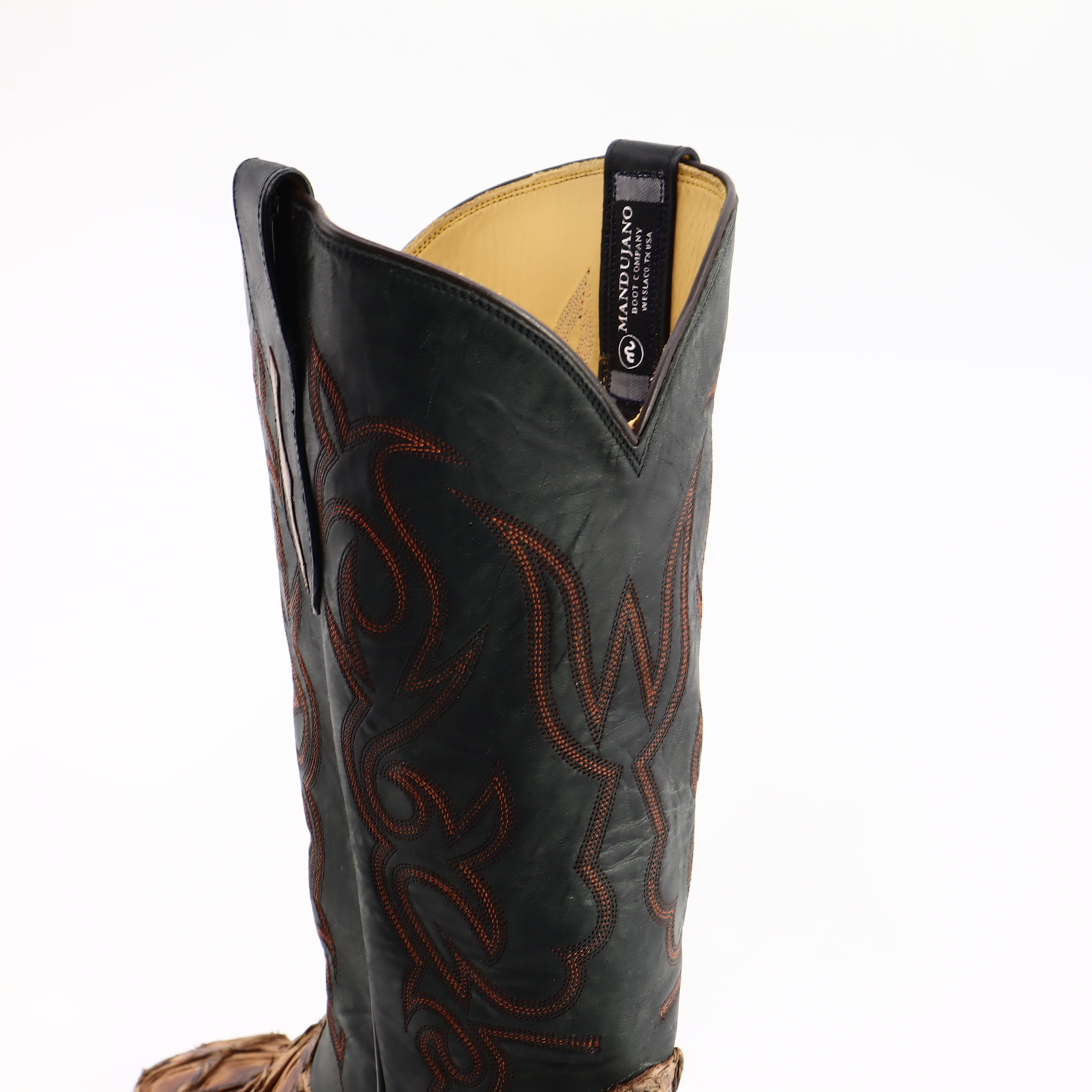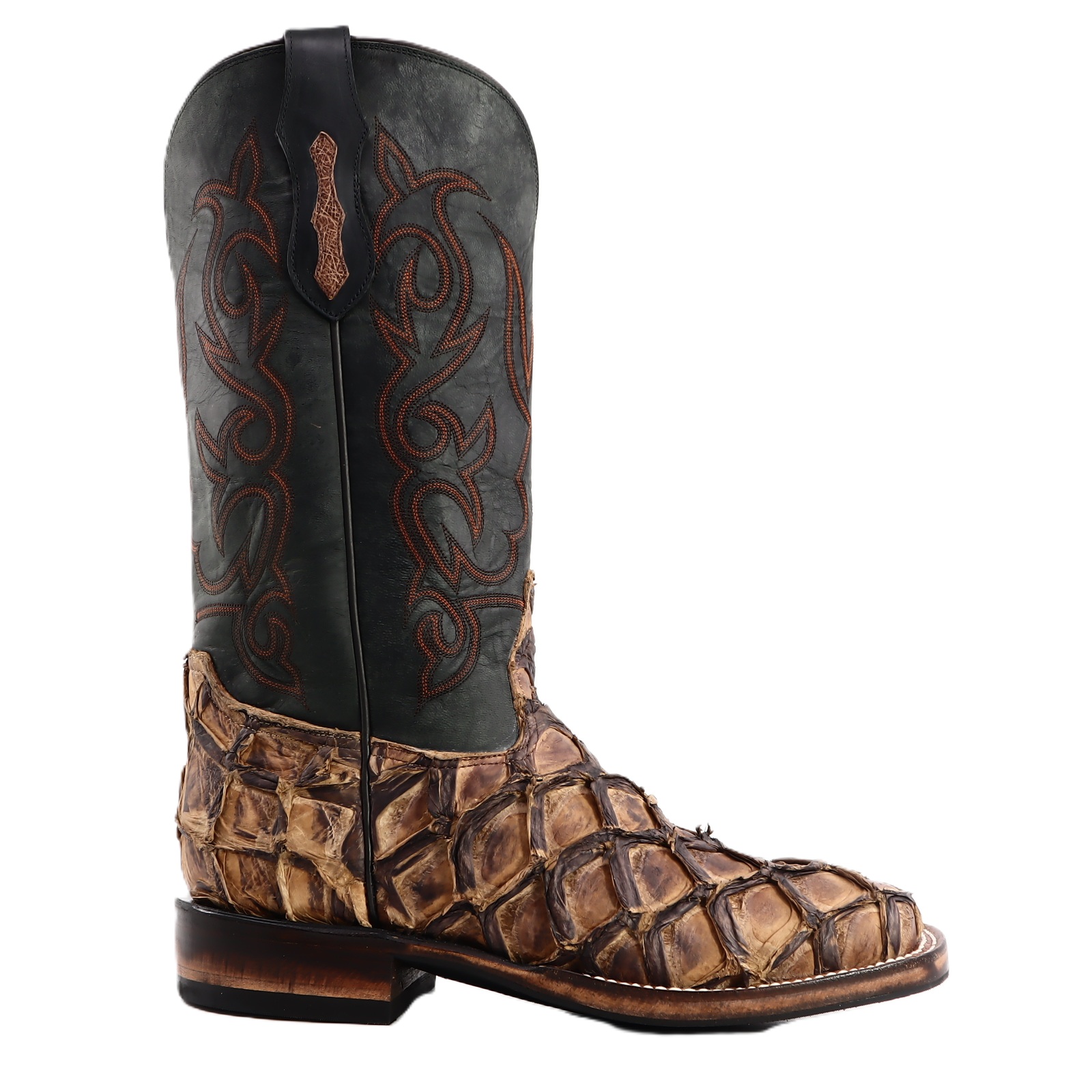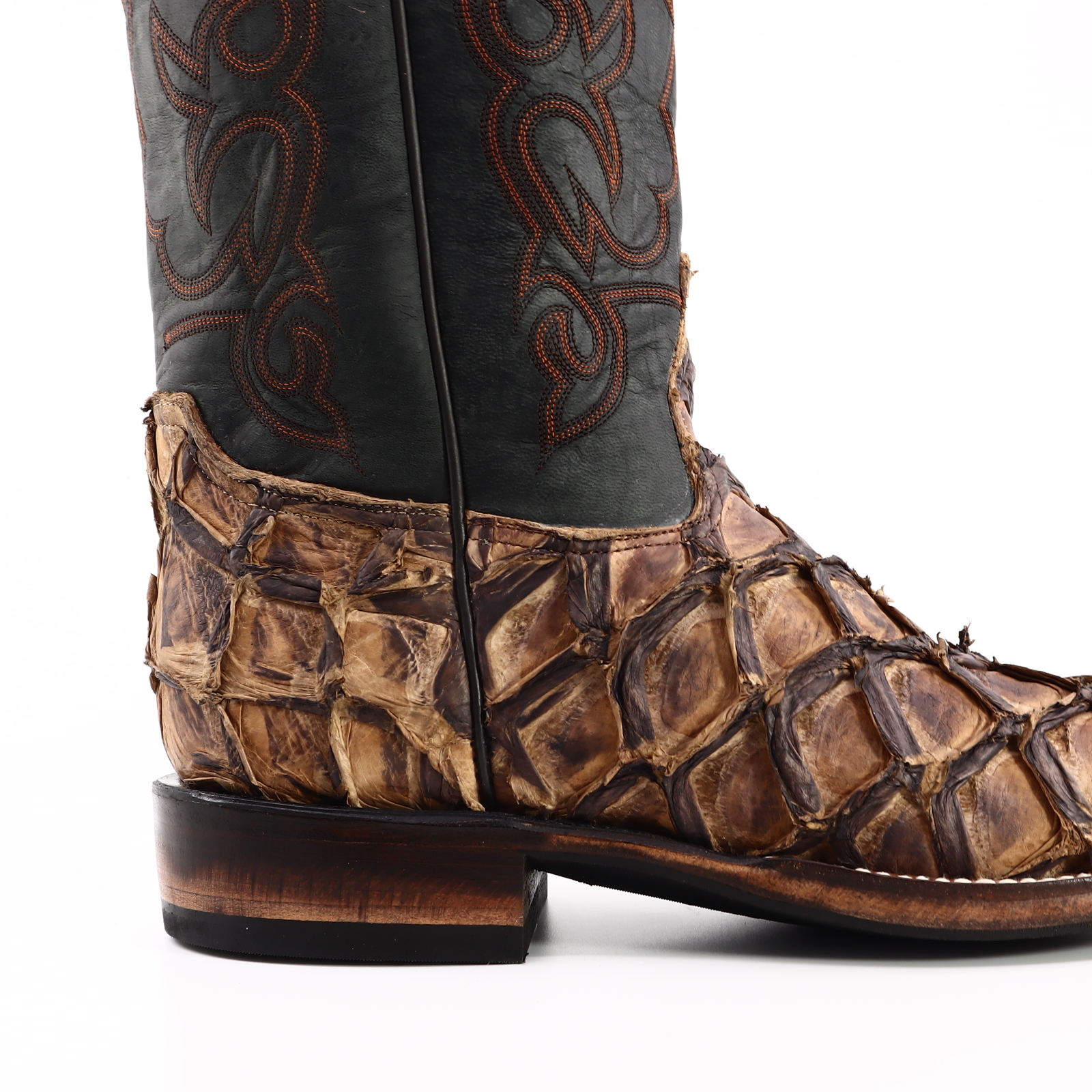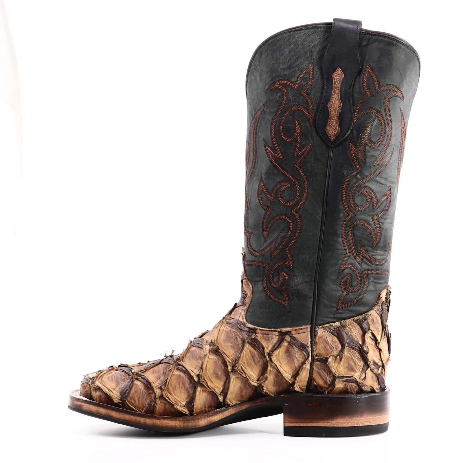This boot stands 13″ tall, constructed with a South American freshwater fish, Big Bass skin. Big bass skin is sturdy and resilient, offering a tactile, three-dimensional feel. The shaft is constructed with Grade A Premium Goat skin, featuring a 6-row stitching pattern with exotic outlay pull straps. The premium cushioned insole offers lasting comfort and support and its double stitched welt around the leather outsole guarantees durability for extended wear. Lemonwood pegging construction. Imported Leather insole and outsole. Proudly custom made and designed in Weslaco, Texas