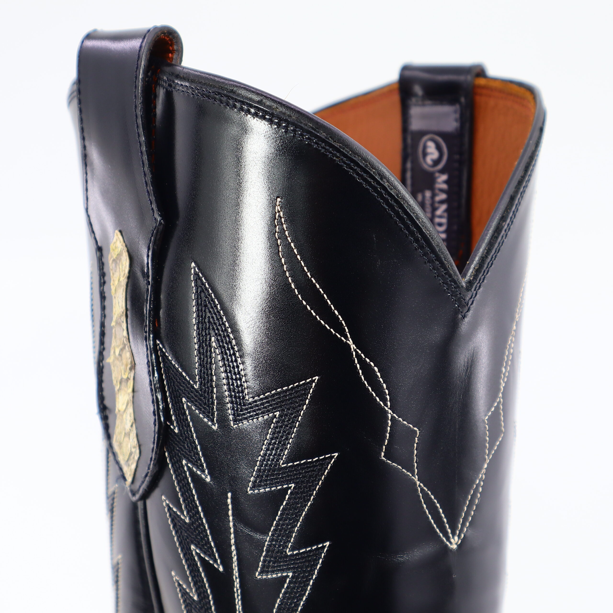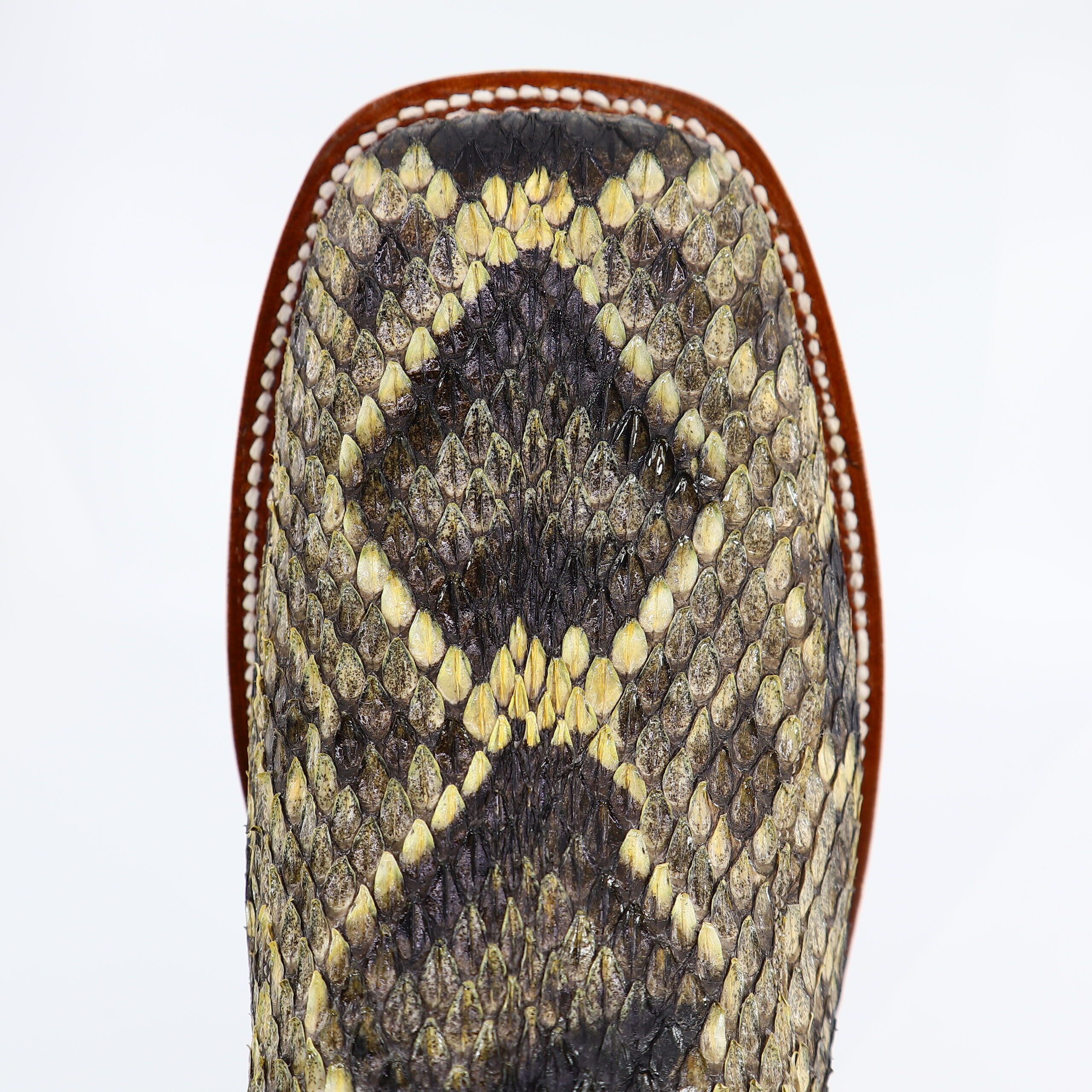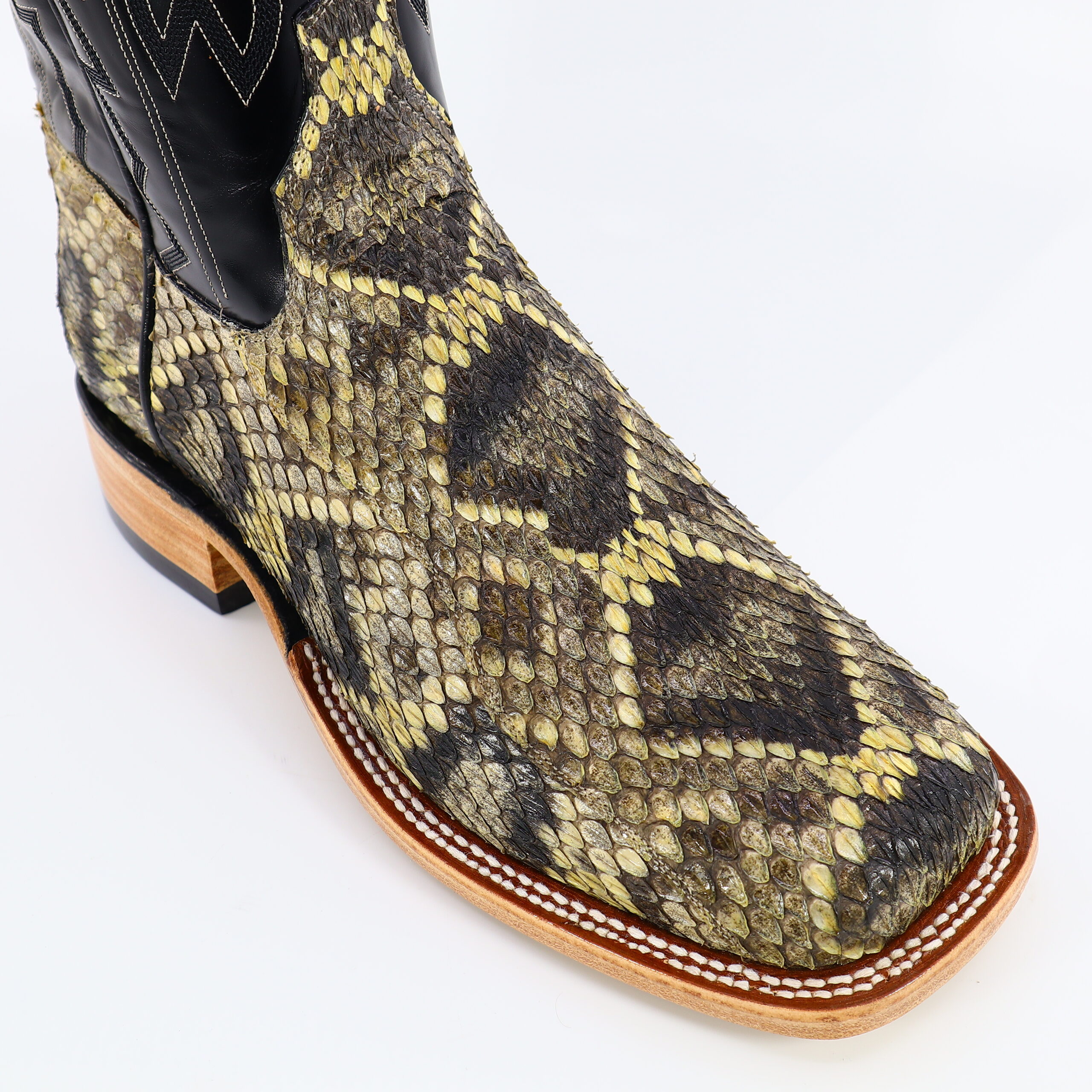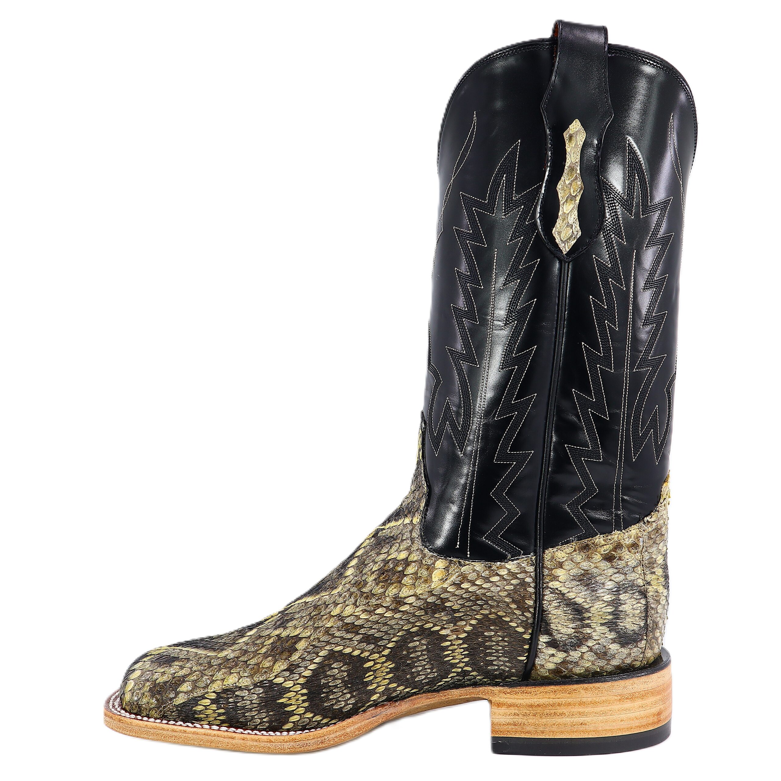 Built with bite. This 13″ Eastern Diamondback Rattle snake boot strikes the perfect balance between wild grit and handcrafted precision. The shaft is complimented with Grade A-Black Indian goat skin, a six-row stitching design and exotic pull straps. Comfortable leather roper heel. Goodyear construction and lemonwood pegging. Double stitched welt construction. Imported leather insole and outsole. Custom made and designed in Weslaco, Texas.