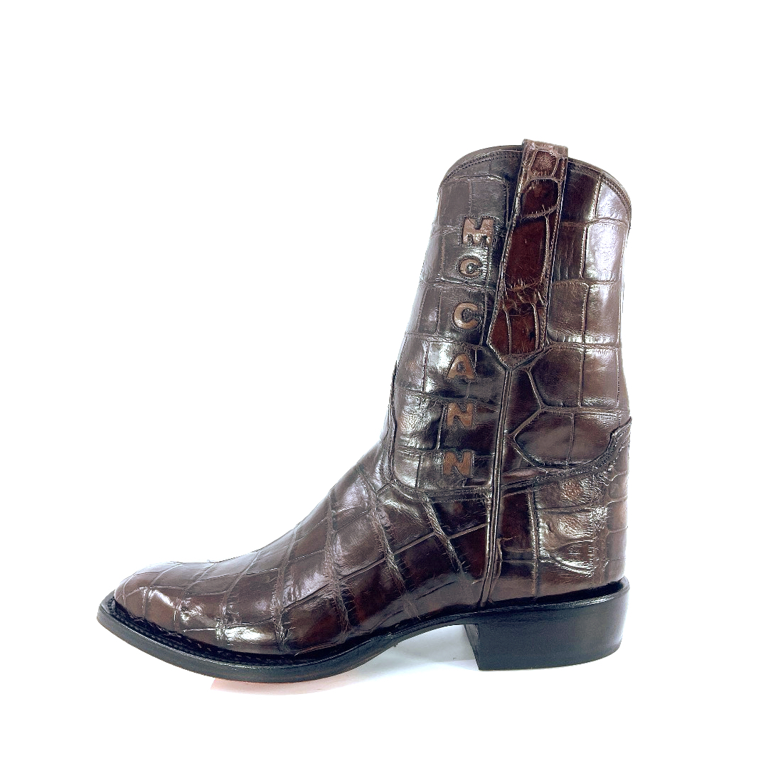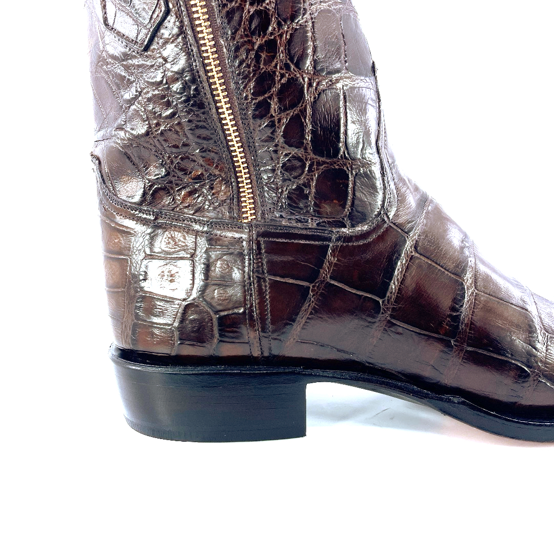 This classic style boot is crafted with American Alligator. The shaft is made of American Alligator and interior premium Grade A leather that offers comfort around the calf. Complimented with a zipper placement, along with a relaxed roper heel and Classic French toe. Due to the authentic nature of skin, shape and markings will vary, making each boot completely unique and unlike any other. Single stitch welt construction. Imported Leather sole. Custom Handmade in Weslaco, Texas.