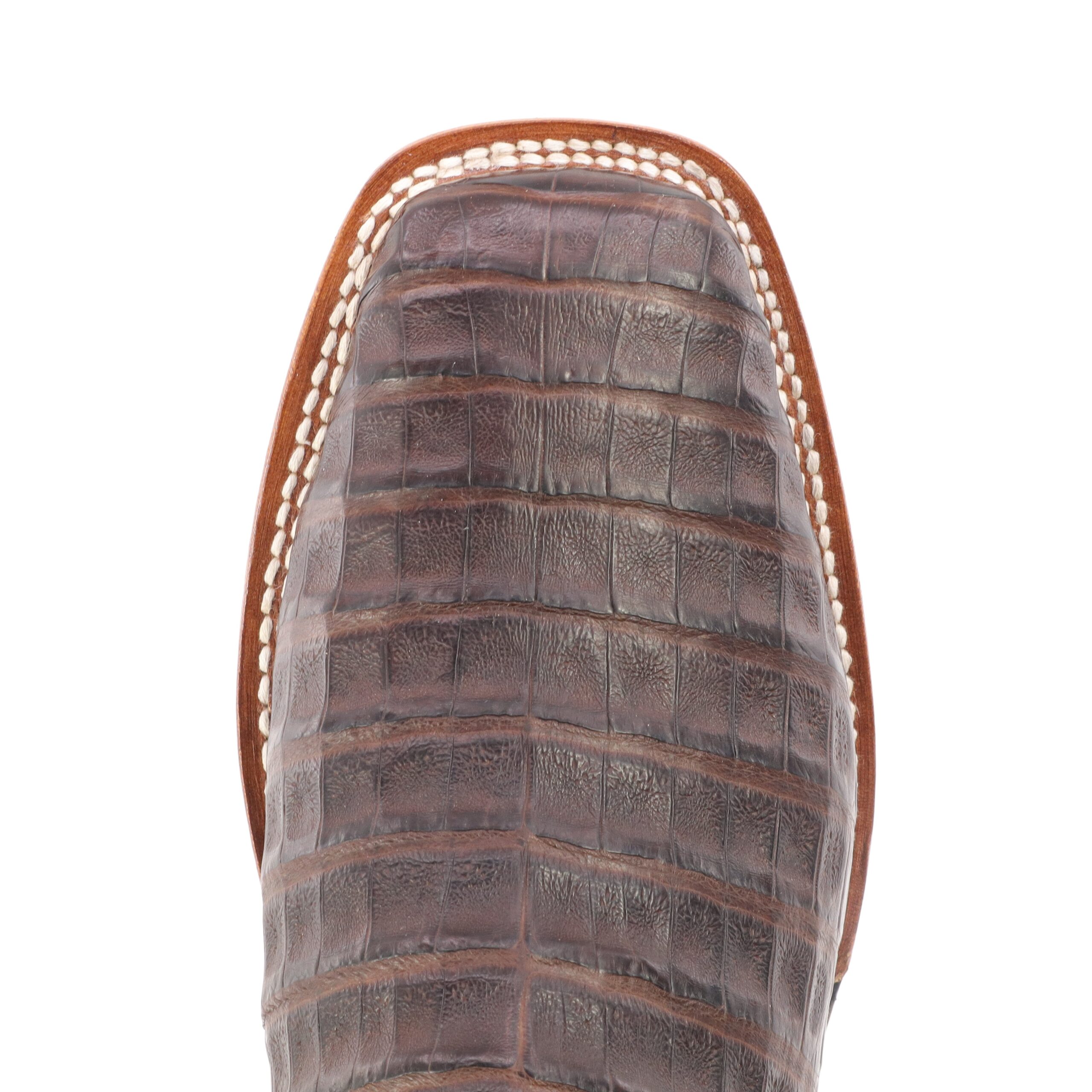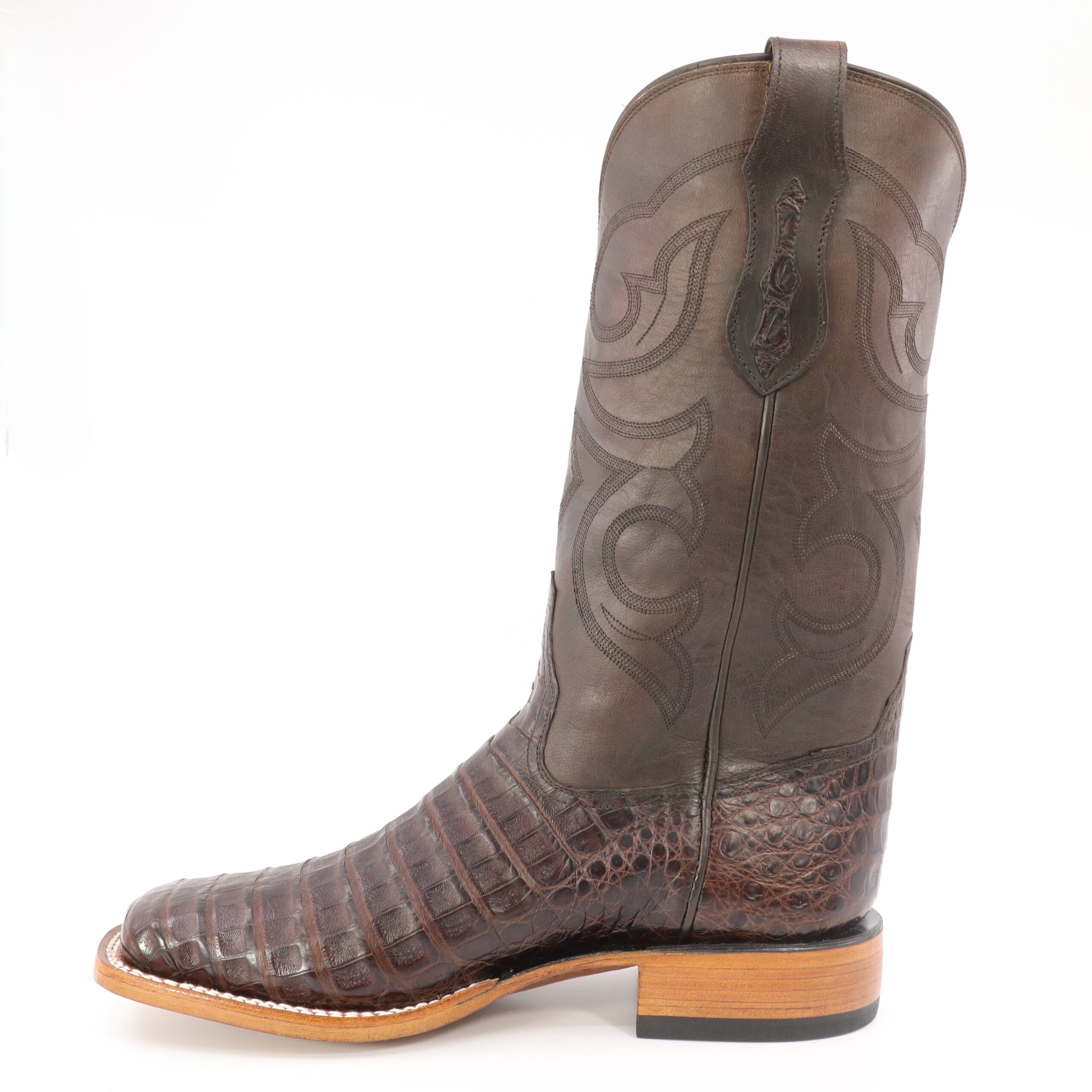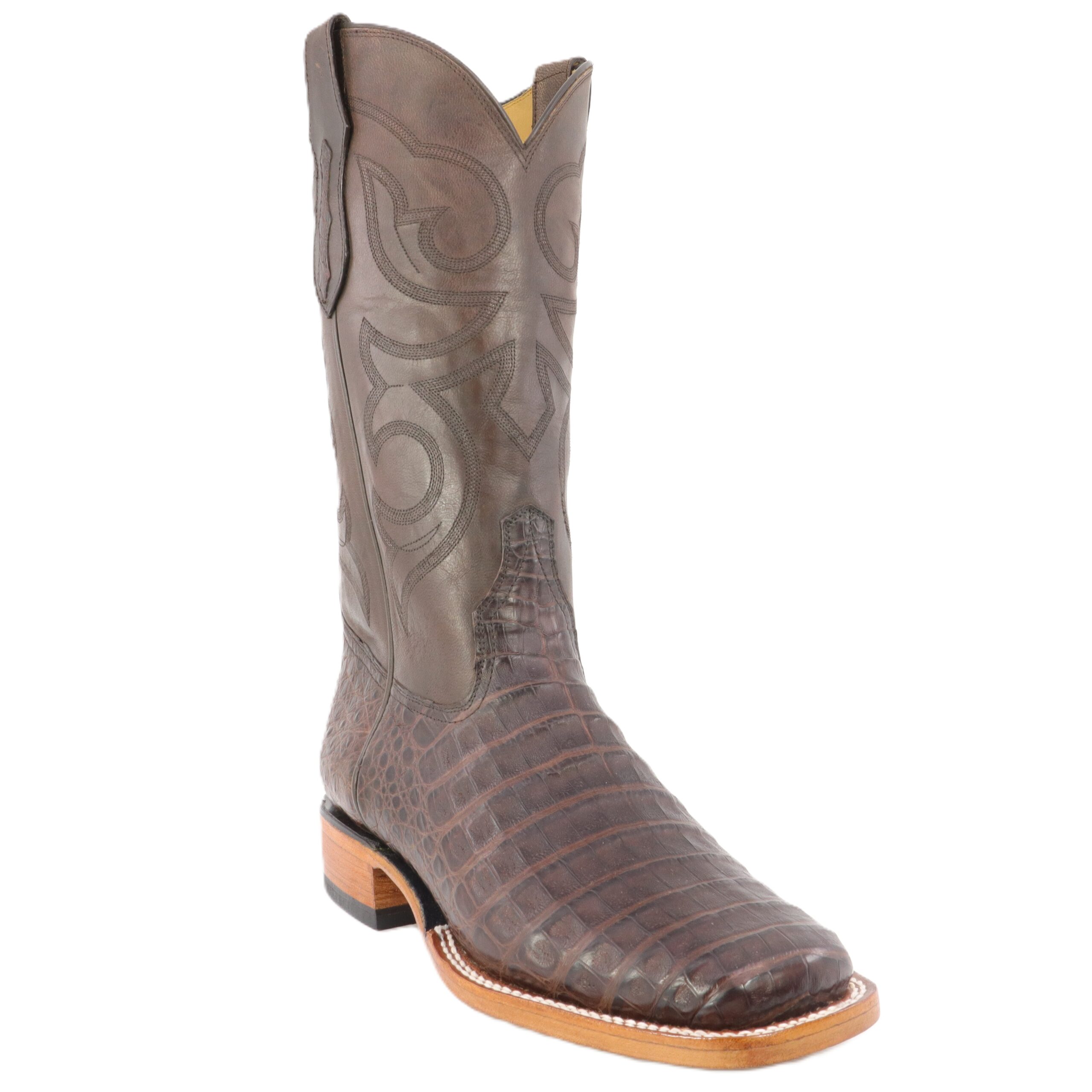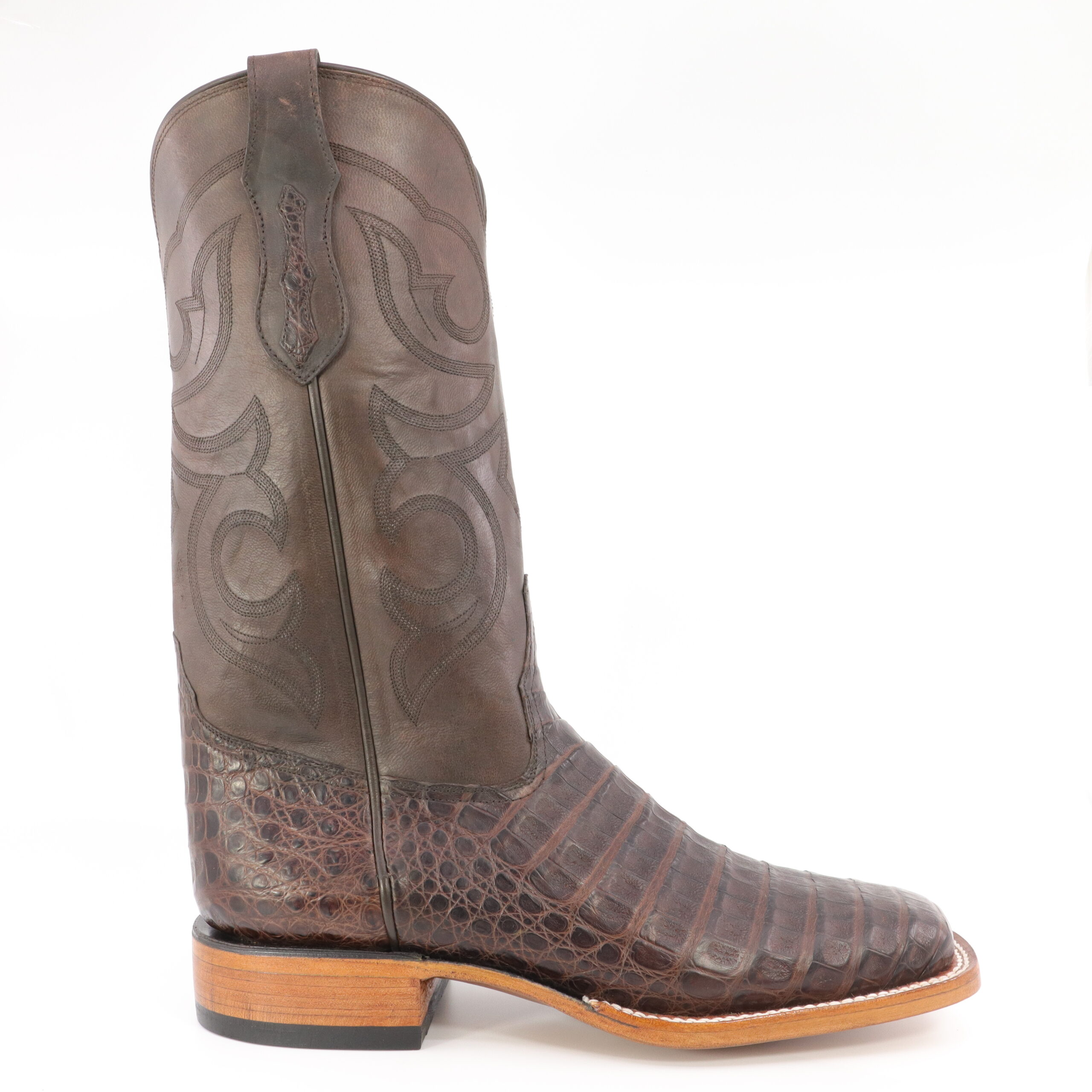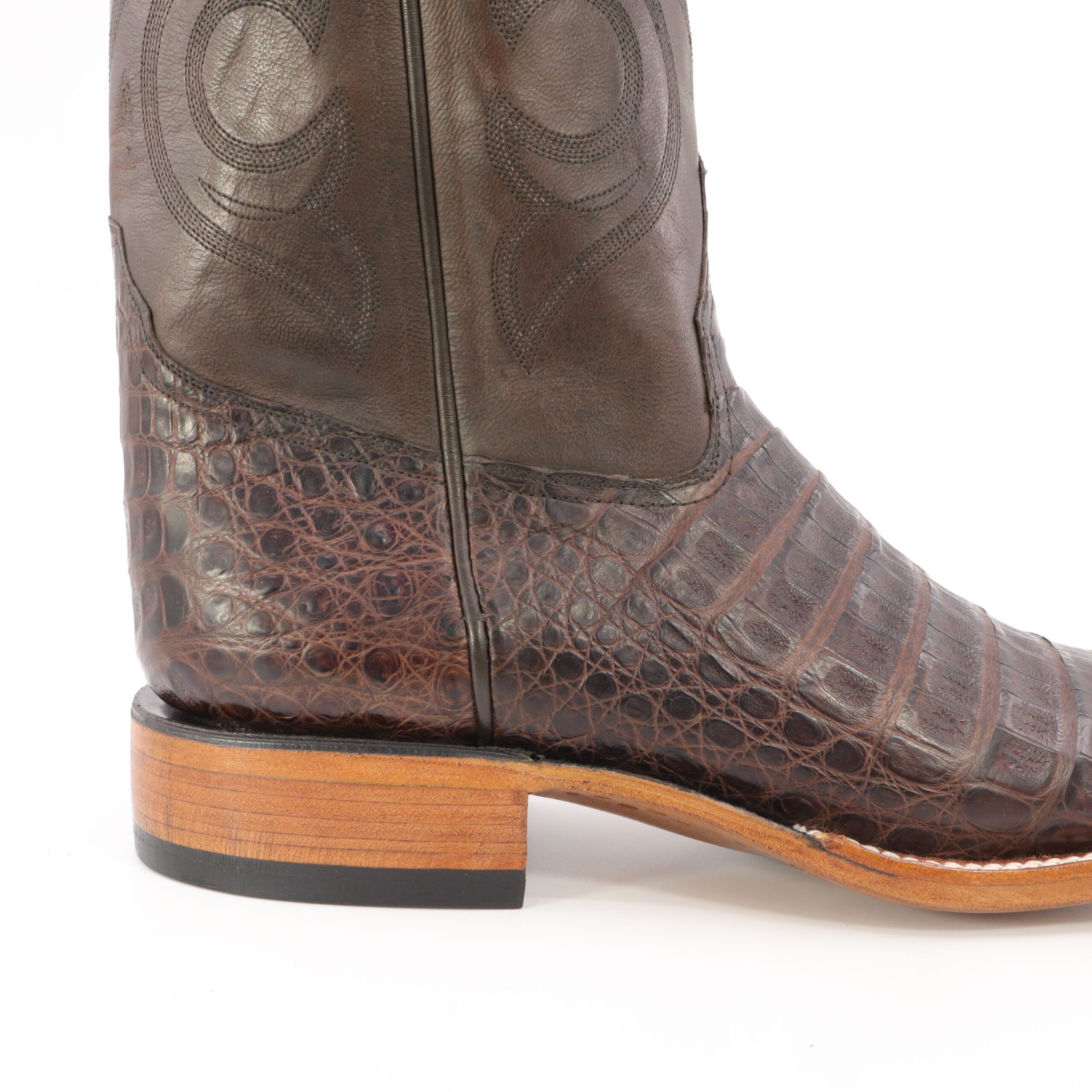 Built from the finest Caiman Belly leather, these 13″ top boots combine rugged toughness with a striking exotic look. Every scale tells a story of resilience, making each pair unique. The shaft is constructed with Grade A Premium Goat skin and features a 6-row stitching design and exotic pull straps. The premium cushioned insole offers lasting comfort and support and its double stitched welt construction around the leather outsole guarantees durability for extended wear. Lemonwood pegging construction. Imported Leather insole and outsole. Proudly custom made and designed in Weslaco, Texas.