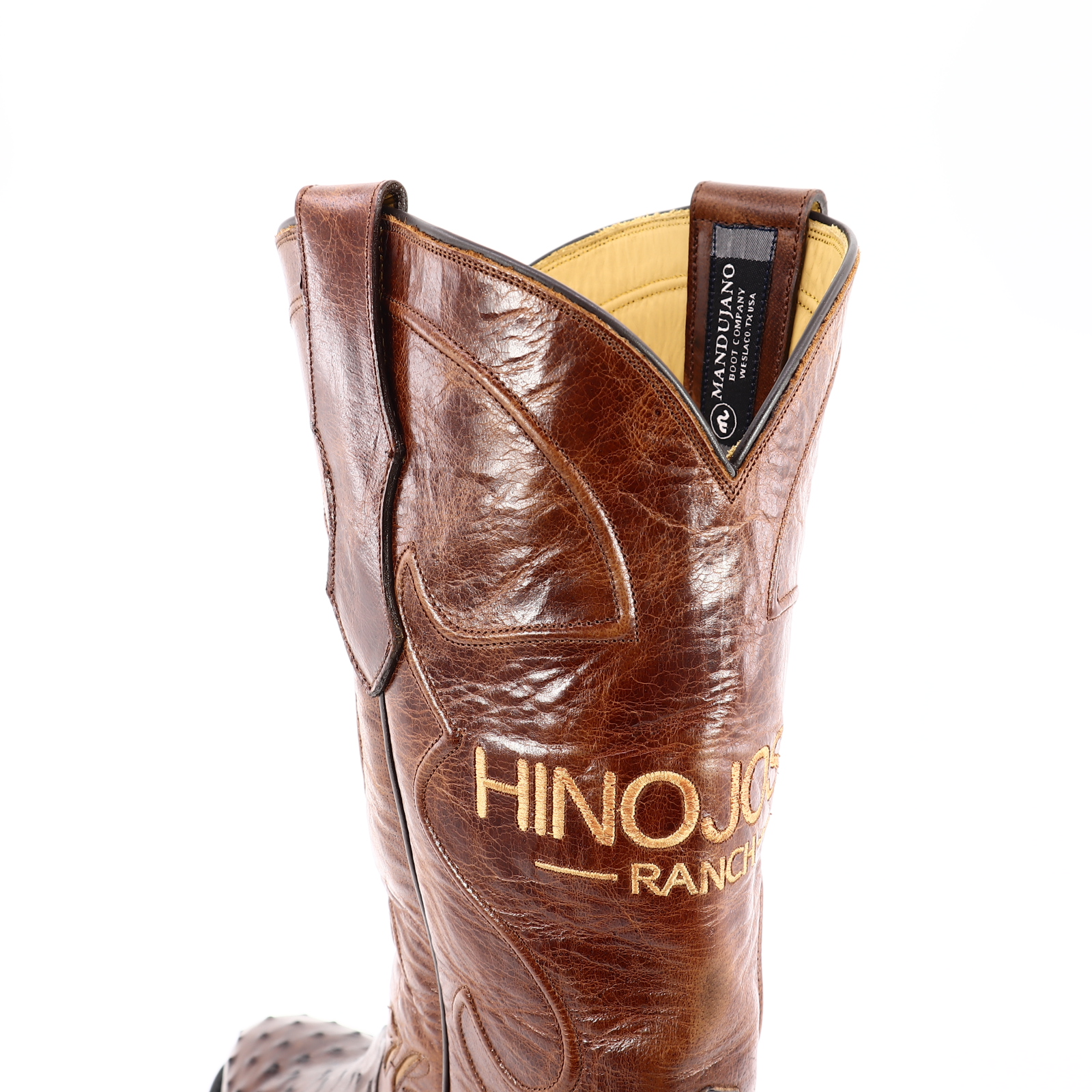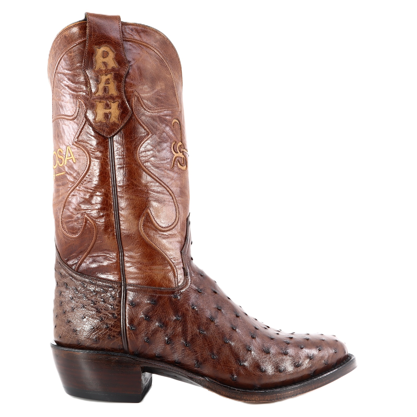 Where durability meets luxury; this boot stands 13″ tall and is constructed with one of our softest skins, Zimbabwe Full Quill Ostrich. This pair offers a distinctive and luxurious feel. The shaft is constructed with rough-out leather that offers comfort around the calf with hand driven cording design. As well, the shaft features two, well-centered monograms “Hinojosa Ranch” with exotic initials “R A H” on the pull-straps for a personalized touch. Due to the authentic nature of the Ostrich, shape and markings will vary, making each boot completely unique and unlike any other. The premium cushioned insole offers lasting comfort and support. Single stitched welt construction around the leather outsole guarantees durability for extended wear. Lemonwood pegging construction. Imported leather soles. Proudly Custom Handmade in Weslaco, Texas.