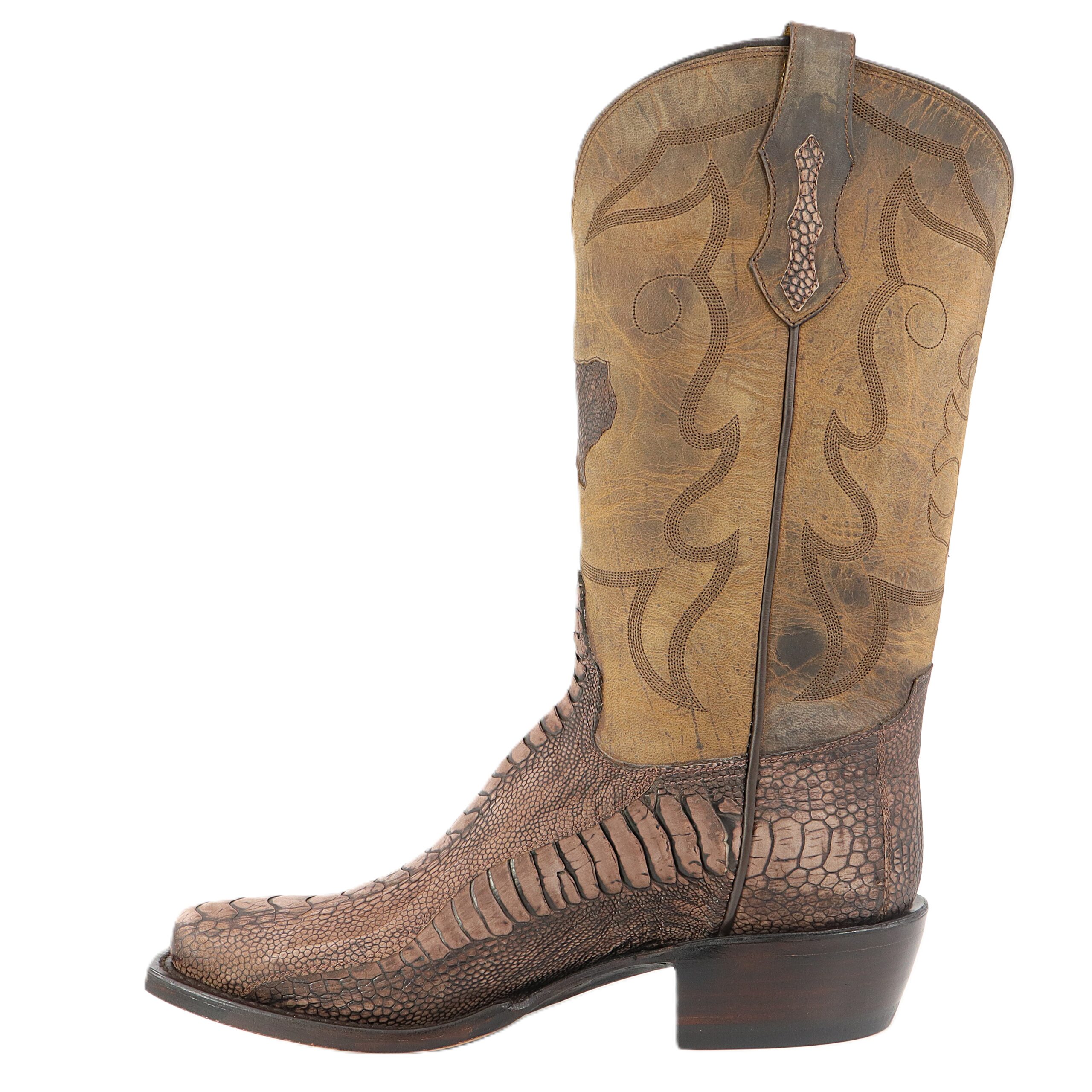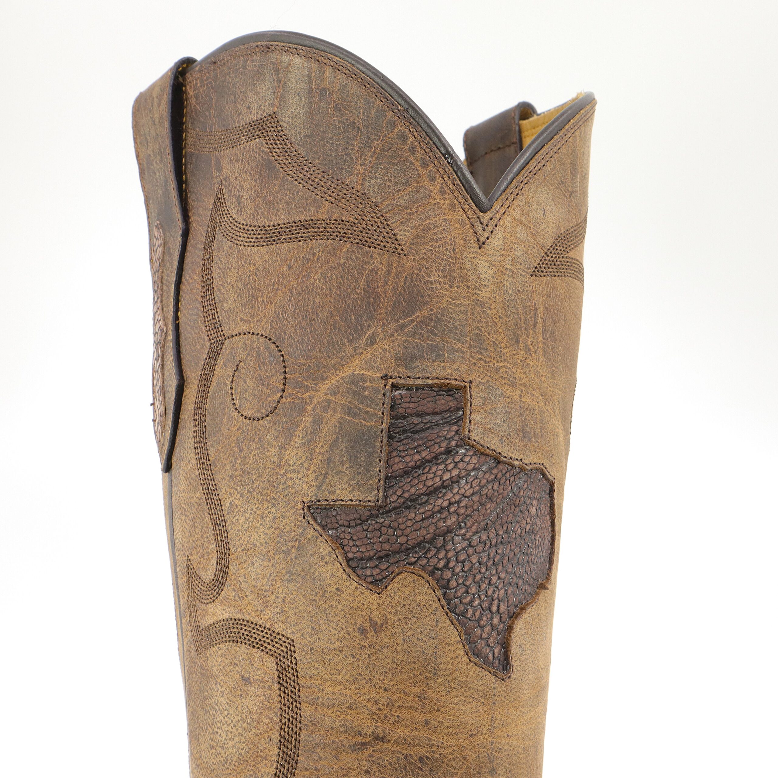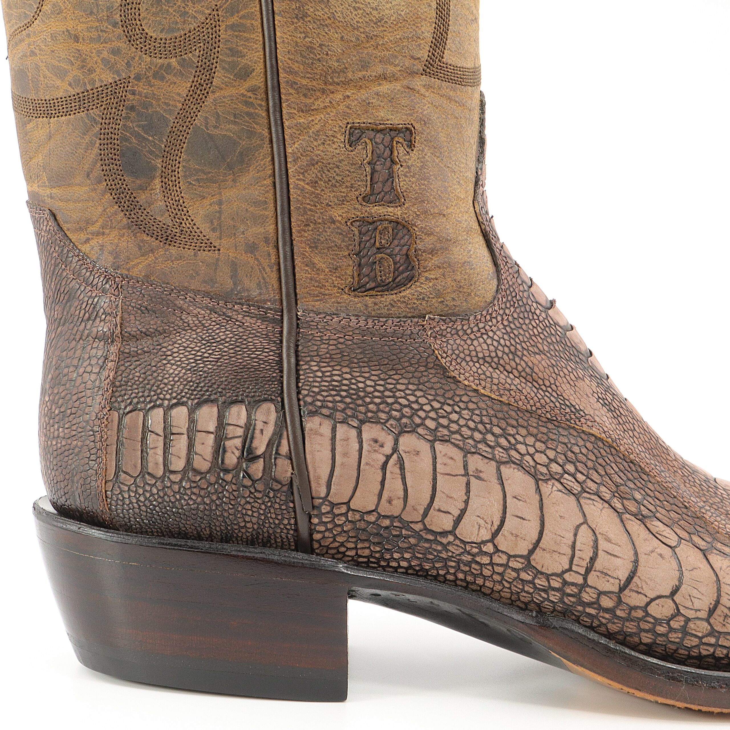 Known for its bold, scale-like pattern, ostrich leg delivers durability with a striking exotic look. This pair is blending rugged toughness with refined craftsmanship. The shaft is constructed with Grade A Premium Goat skin, featuring a well centered Texas monogram, exotic overlay pulls straps and personalized initials “T B.” Due to the authentic nature of the Ostrich, shape and markings will vary, making each boot completely unique and unlike any other. The premium cushioned insole offers lasting comfort and support. Single stitched welt construction around the leather outsole guarantees durability for extended wear. Lemonwood pegging construction. Imported leather soles. Proudly Custom Handmade in Weslaco, Texas.