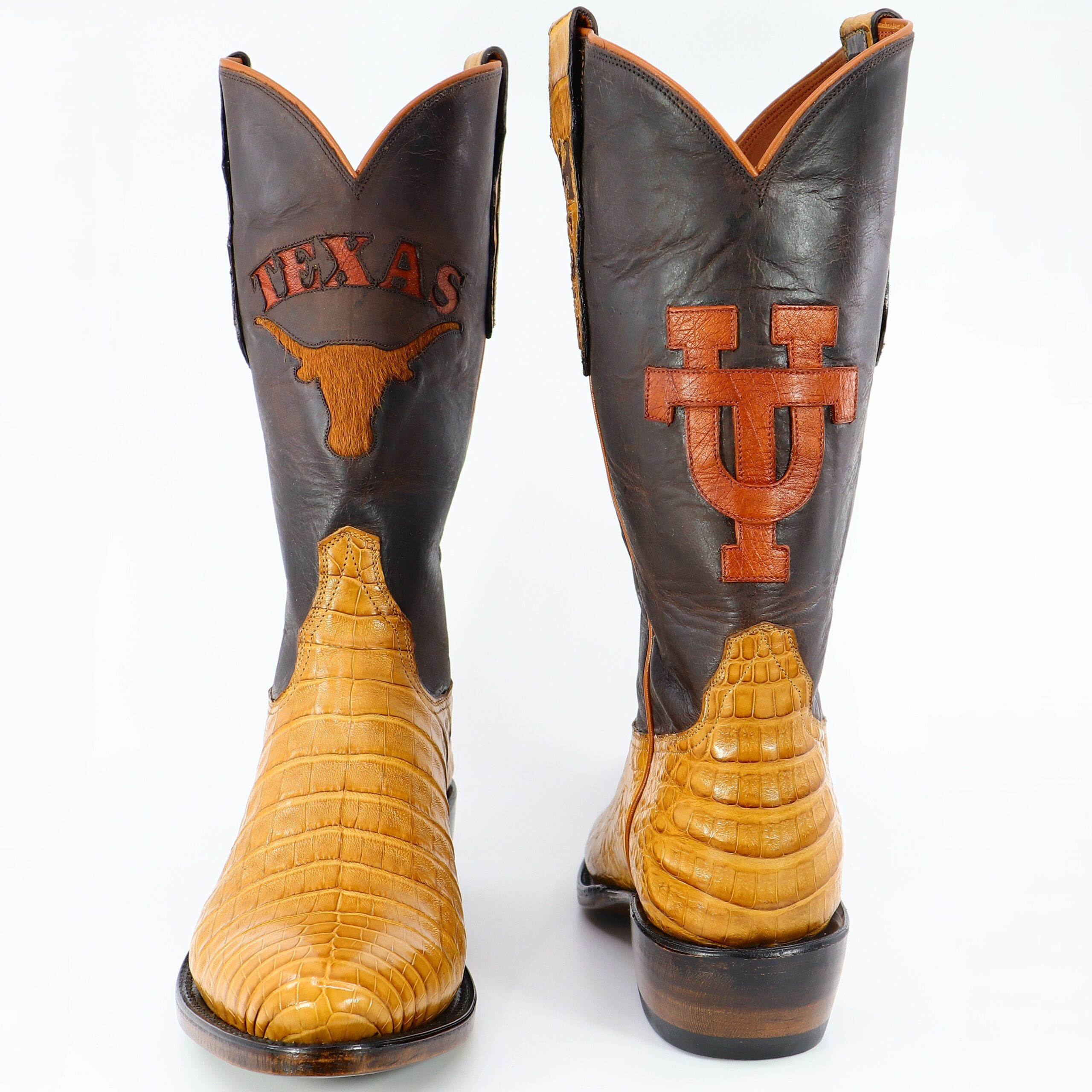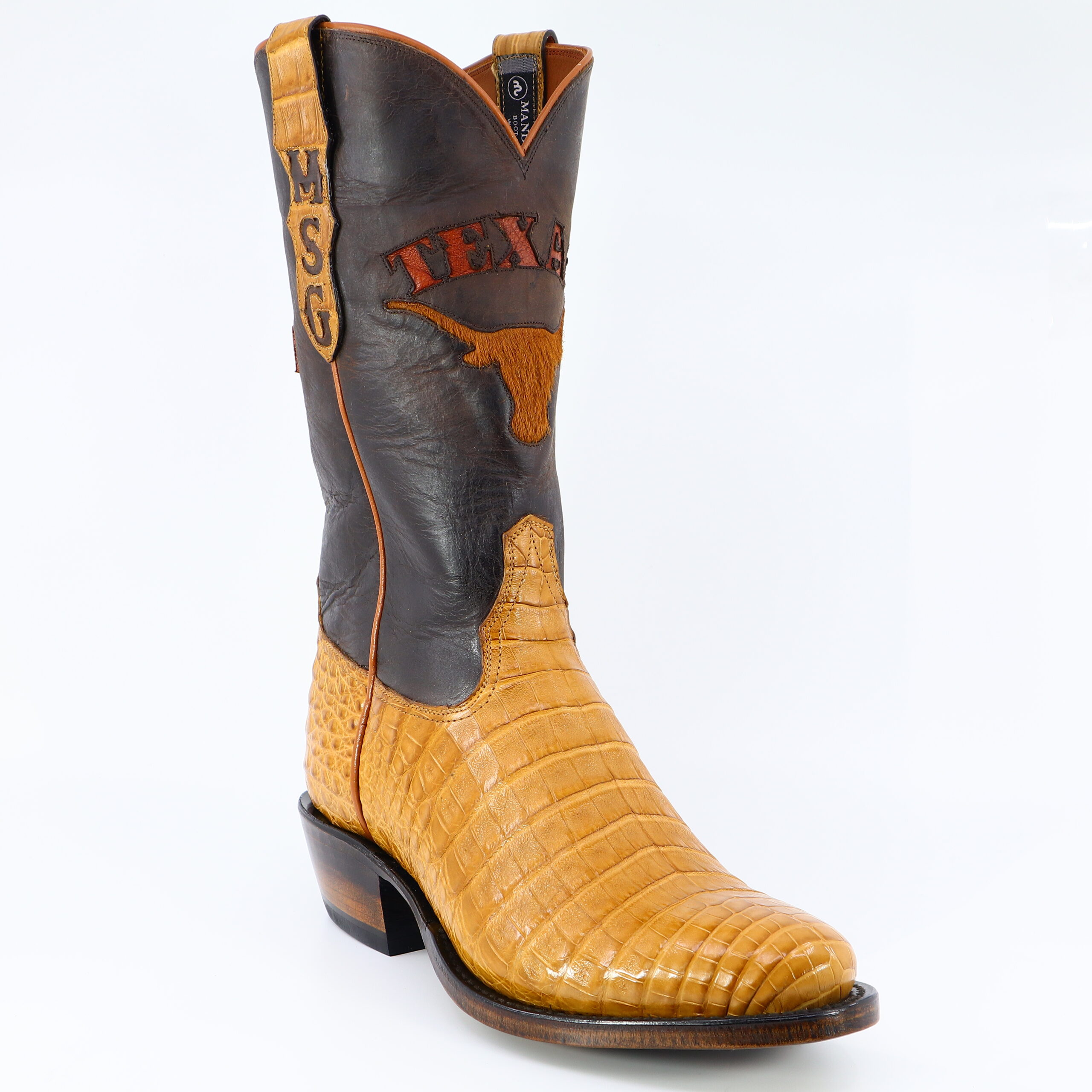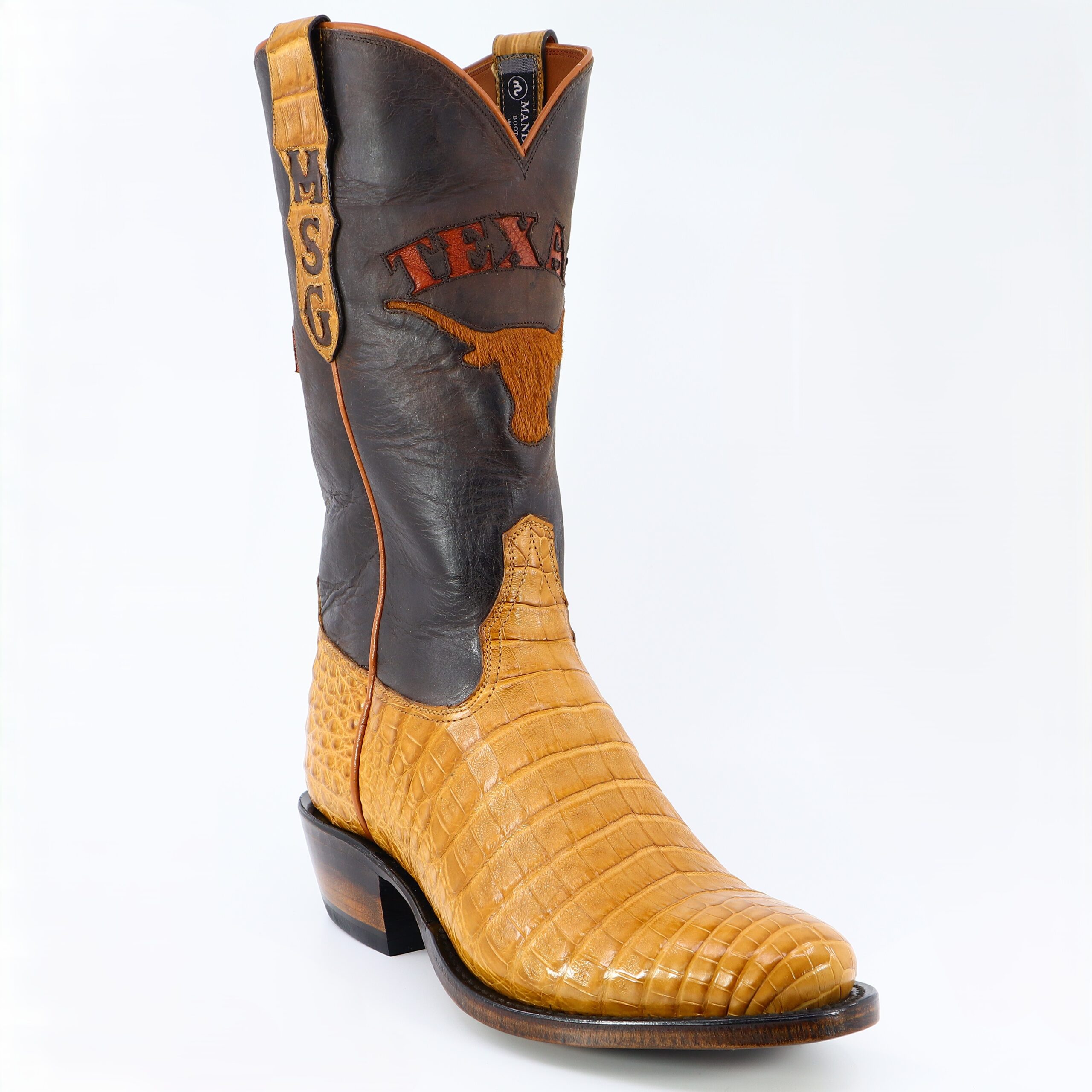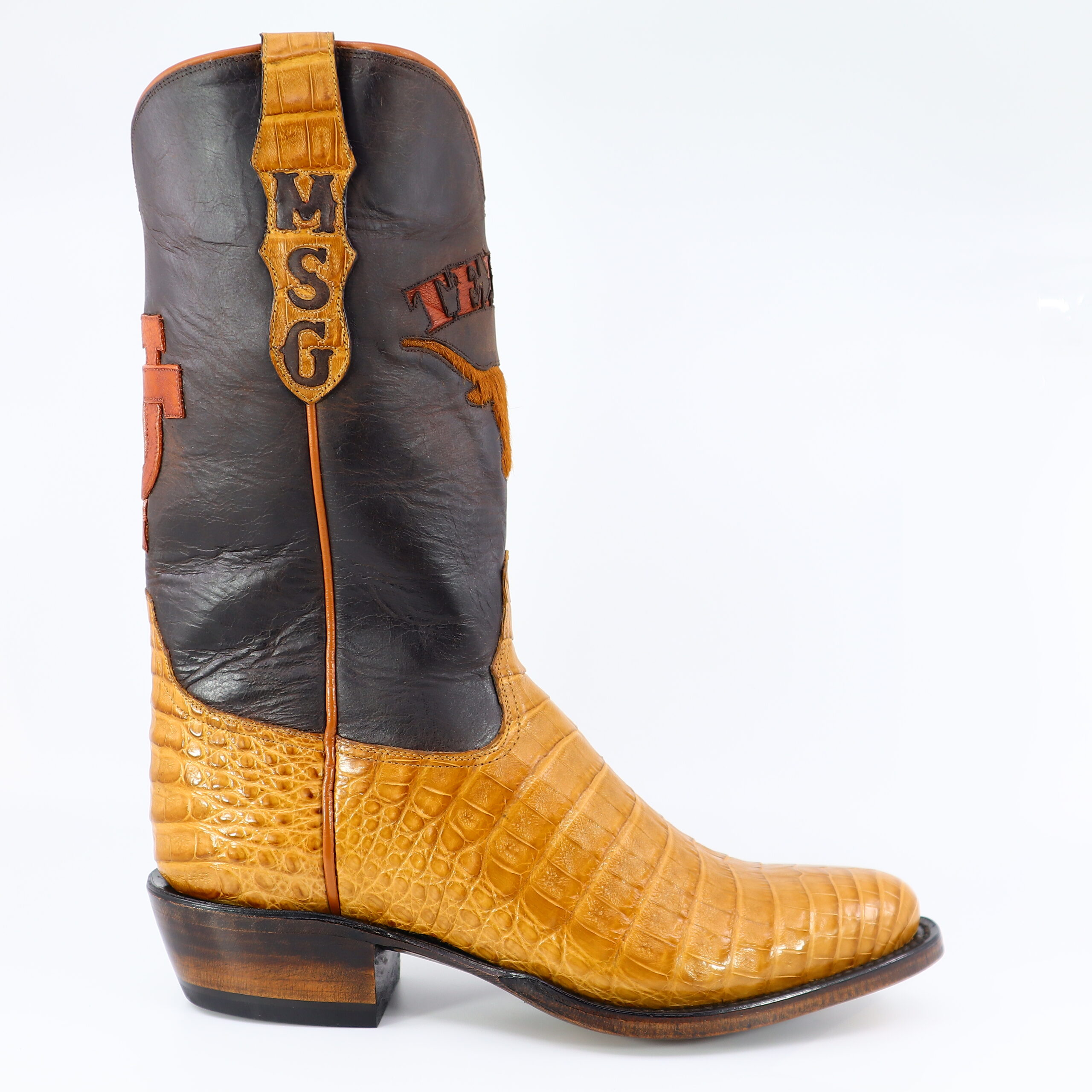 Built for those who carry the Texas Longhorn spirit — handcrafted 13″ top caiman belly boots that command attention with every step. This pair showcases the bold, natural scale pattern that makes caiman belly exotic and distinctive. The shaft is constructed from Grade A Premium Goat skin and features a stitching design and exotic outlay pull straps. The premium cushioned insole offers lasting comfort and support and its single stitched welt construction around the leather outsole guarantees durability for extended wear. Lemonwood pegging construction. Imported Leather insole and outsole. Proudly custom made and designed in Weslaco, Texas.