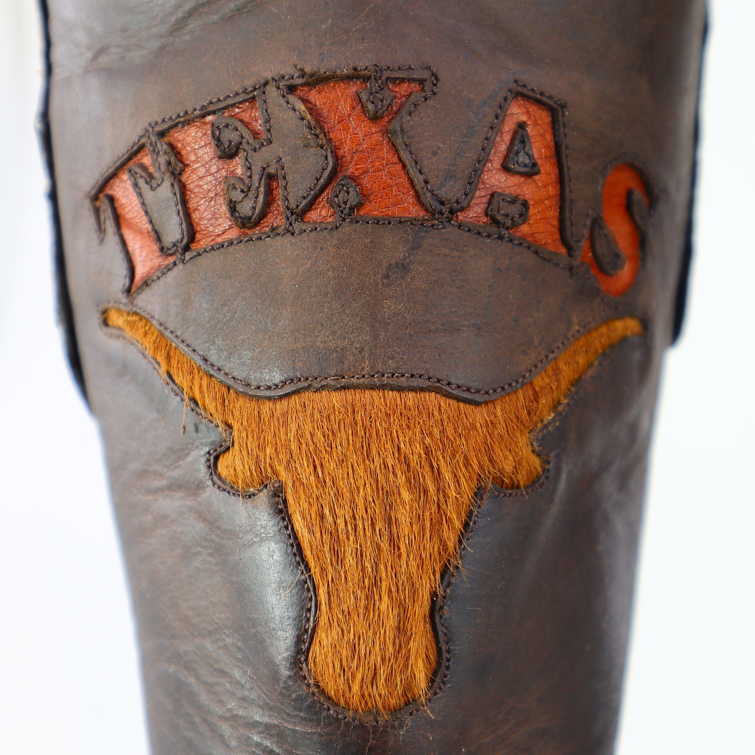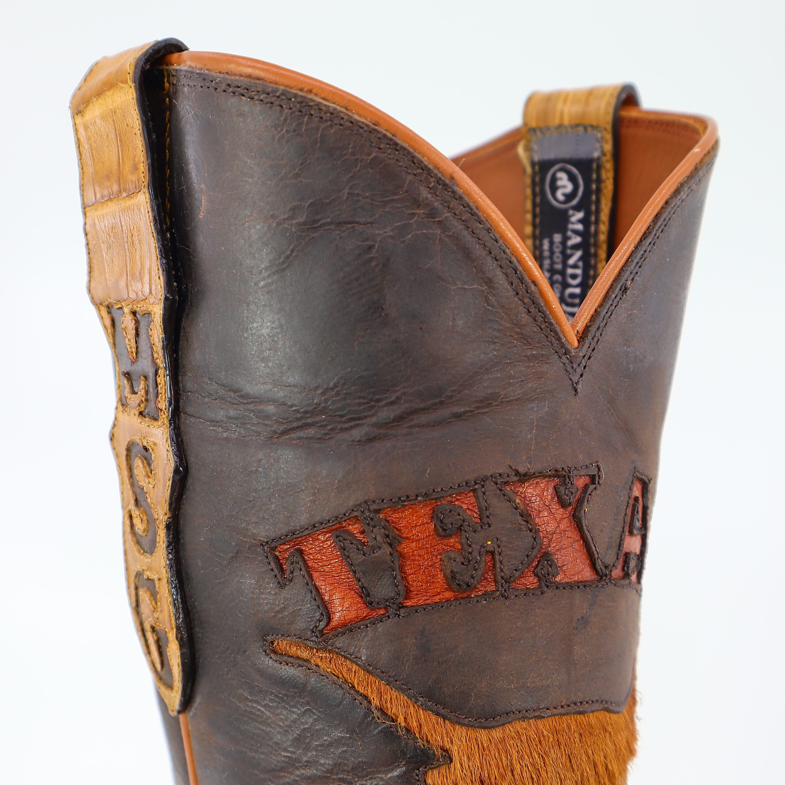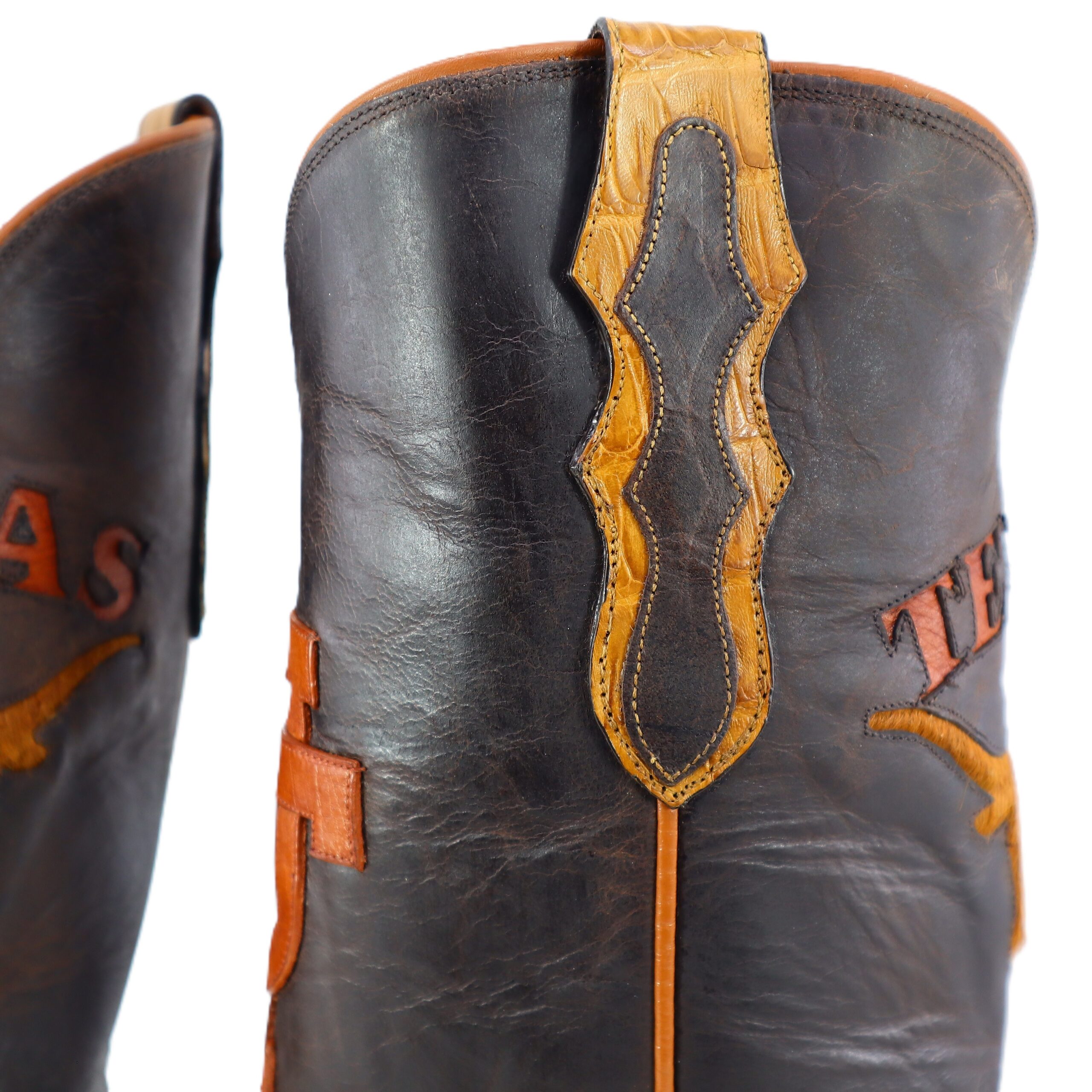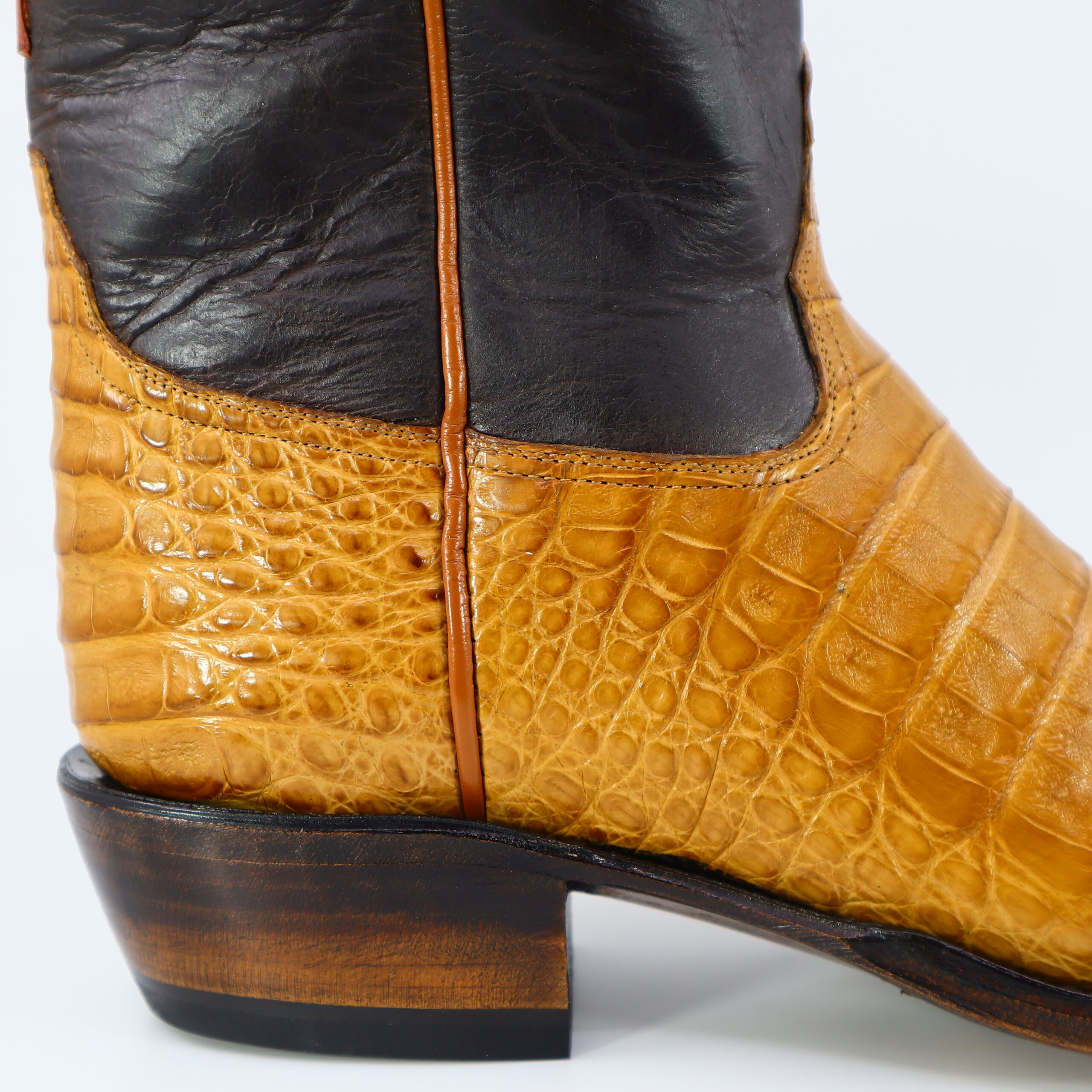 Built for those who carry the Texas Longhorn spirit — handcrafted 13″ top caiman belly boots that command attention with every step. This pair showcases the bold, natural scale pattern that makes caiman belly exotic and distinctive. The shaft is constructed from Grade A Premium Goat skin and features a stitching design and exotic outlay pull straps. The premium cushioned insole offers lasting comfort and support and its single stitched welt construction around the leather outsole guarantees durability for extended wear. Lemonwood pegging construction. Imported Leather insole and outsole. Proudly custom made and designed in Weslaco, Texas.