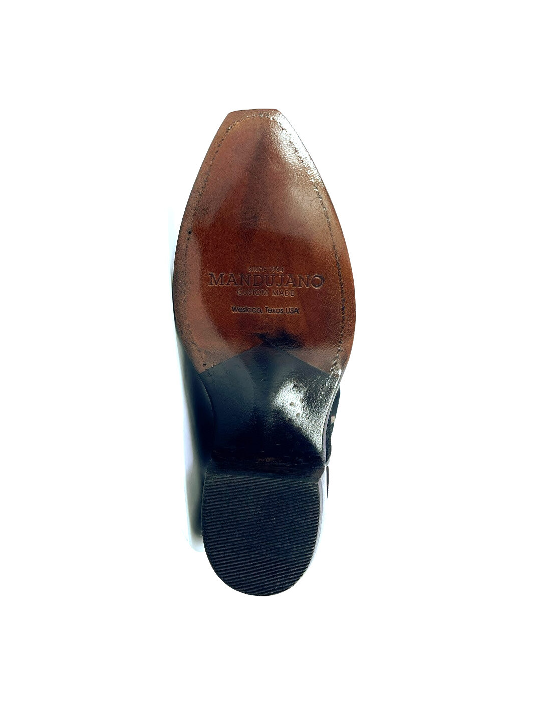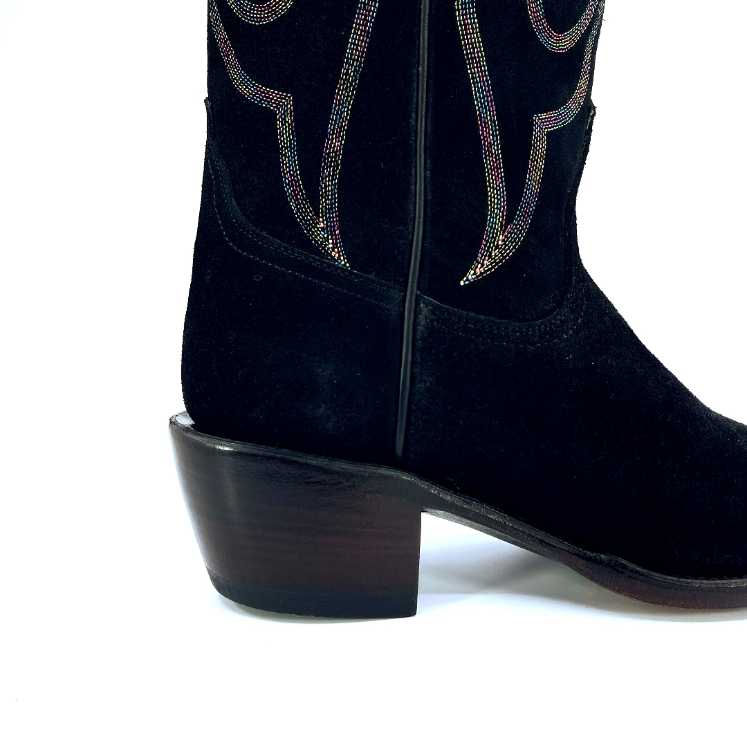 Rough-out leather is smooth to the touch! From the ranch to the runway–complete your outfit with this 15’inch tall boot. Rough-out leather is a soft, velvety-textured leather that enhances the boots depth and warmth for a luxurious feel.  Its non-shiny appearance makes it versatile for pairing with Denim, Dresses or Skirts. The shaft is complimented with rough-out leather and offers comfort around the calf.  The premium cushioned insole offers lasting comfort and support. Single stitched welt construction around the leather outsole guarantees durability for extended wear. Lemonwood pegging construction and leather stacked high walking heels. Imported leather soles. Proudly Custom Handmade in Weslaco, Texas.