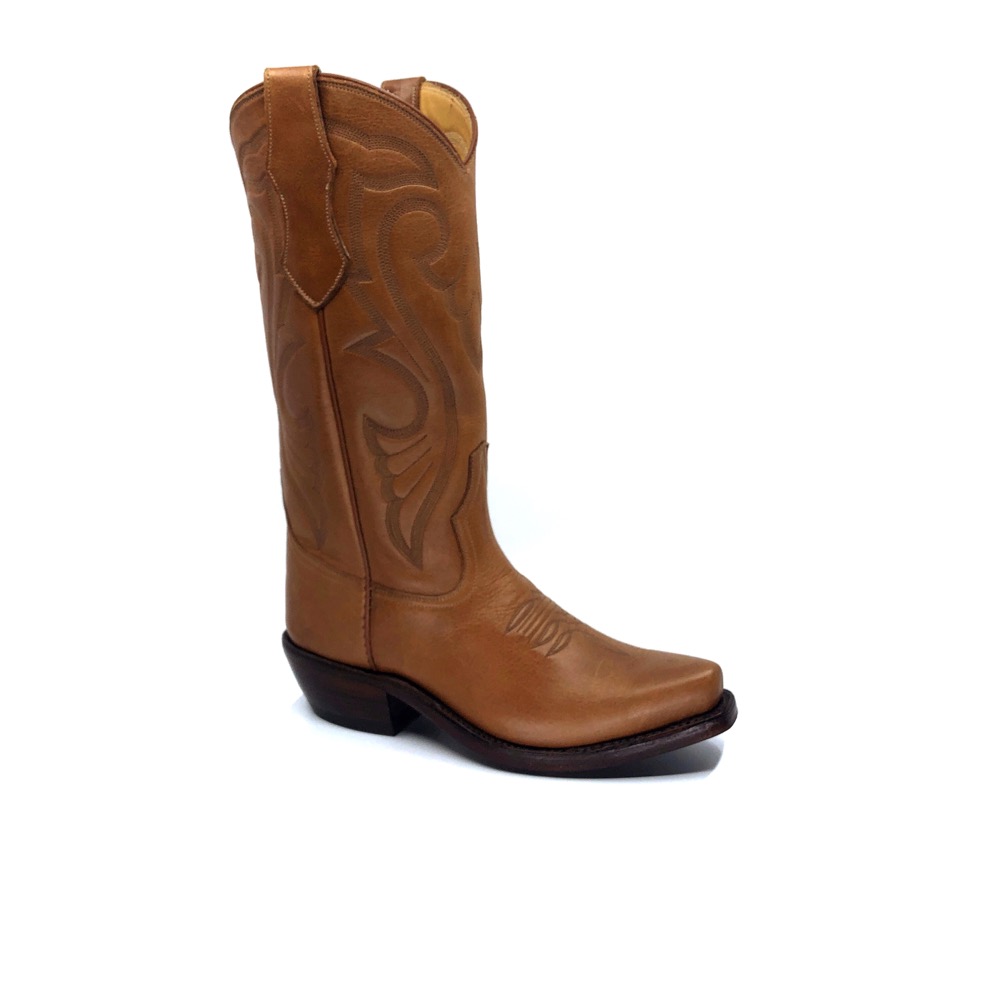 Traditional Western boot constructed with distressed Mad Dog goat, this boot features superb stitch patterns, a traditional snip toe and pull straps . Goodyear construction and lemonwood pegging. Single stitch welt construction. Imported Leather sole. Handmade in Weslaco, Texas.