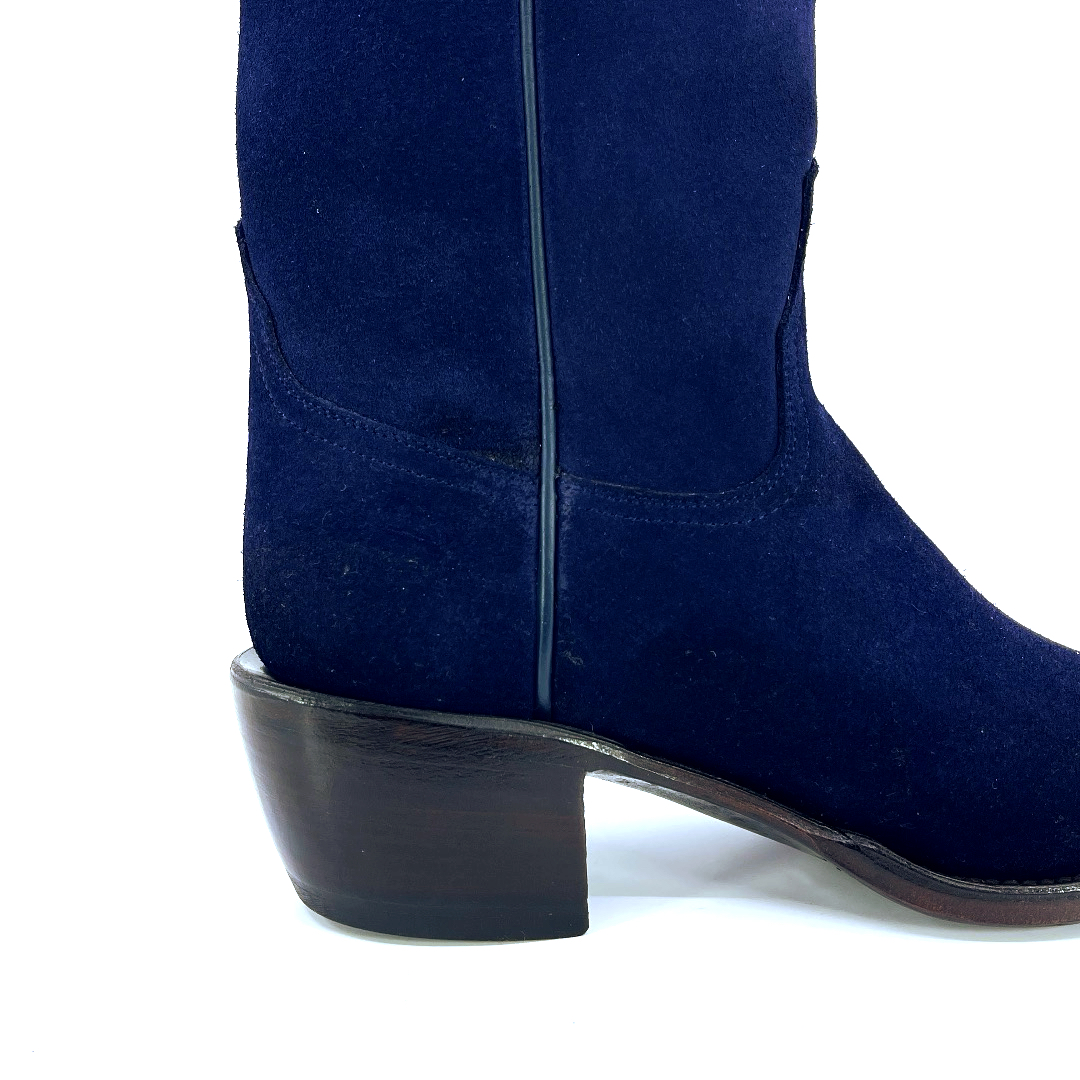 Rough-out leather is smooth to the touch! From the ranch to the runway–complete your outfit with this 15’inch tall boot. Rough-out leather is a soft, velvety-textured leather that enhances the boots depth and warmth for a luxurious feel. Its non-shiny appearance makes it versatile for pairing with Denim, Dresses or Skirts. The shaft is complimented with rough-out leather and offers comfort around the calf. The premium cushioned insole offers lasting comfort and support. Single stitched welt construction around the leather outsole guarantees durability for extended wear. Lemonwood pegging construction and leather stacked high walking heels. Imported leather soles. Proudly Custom Handmade in Weslaco, Texas.