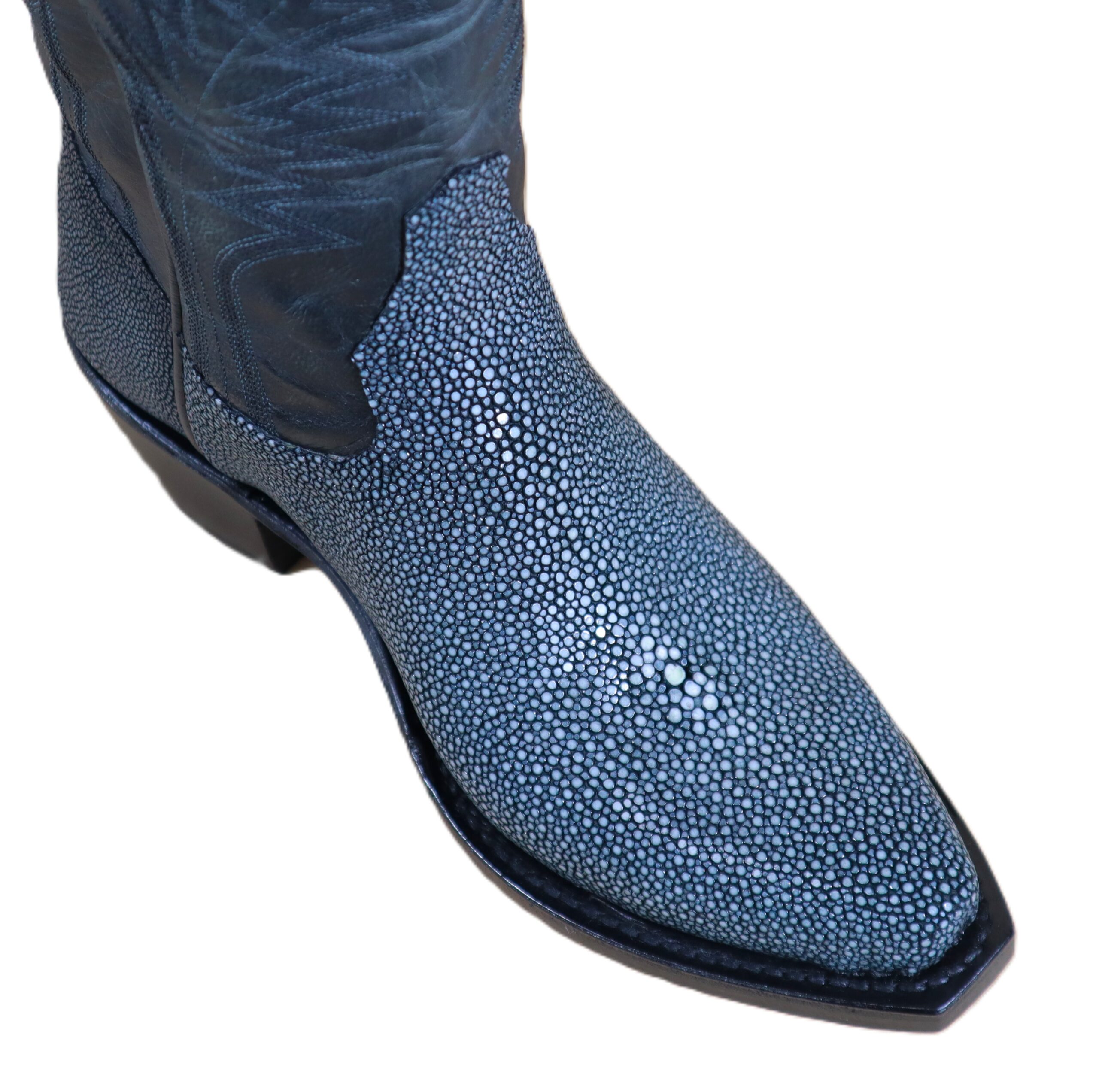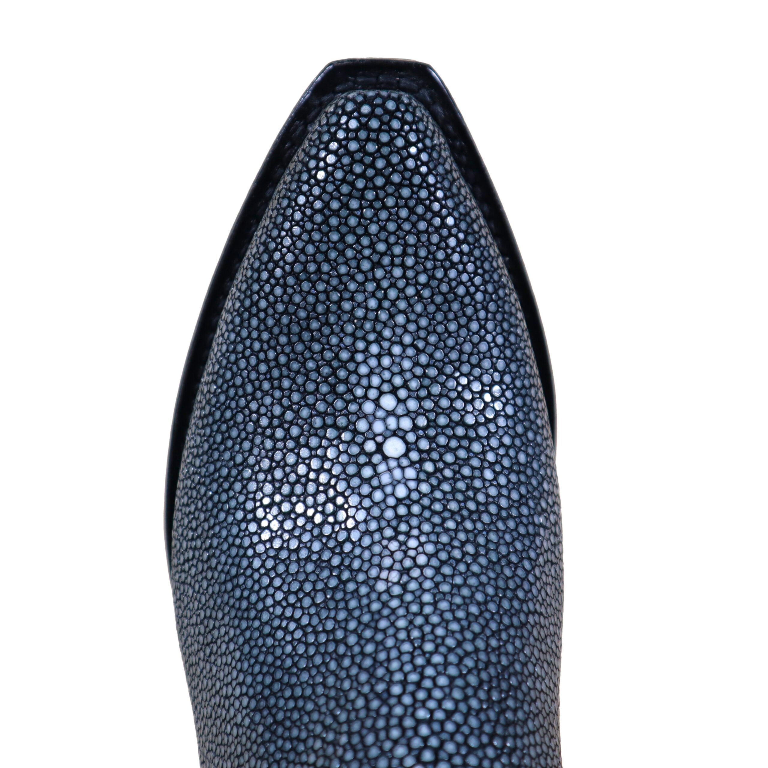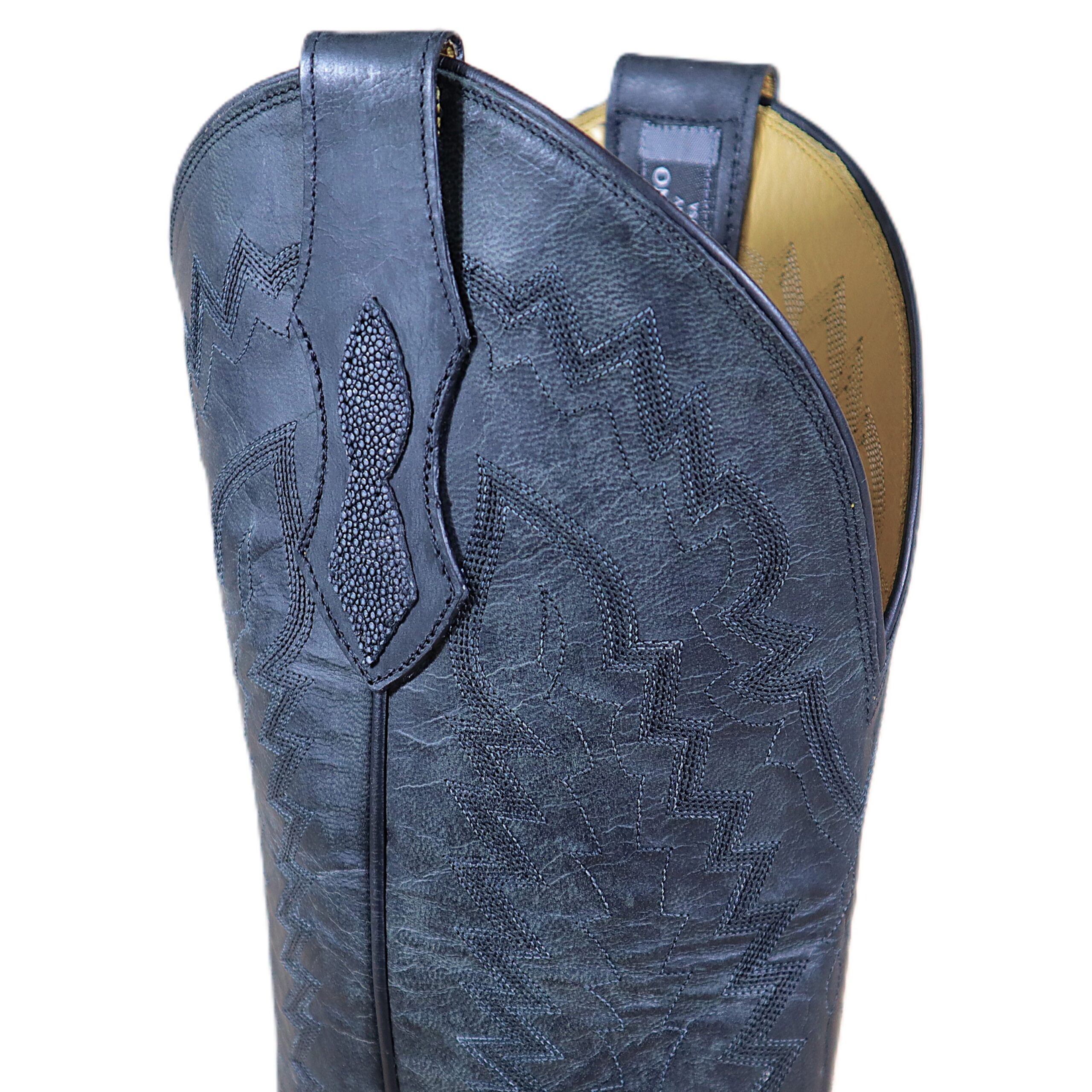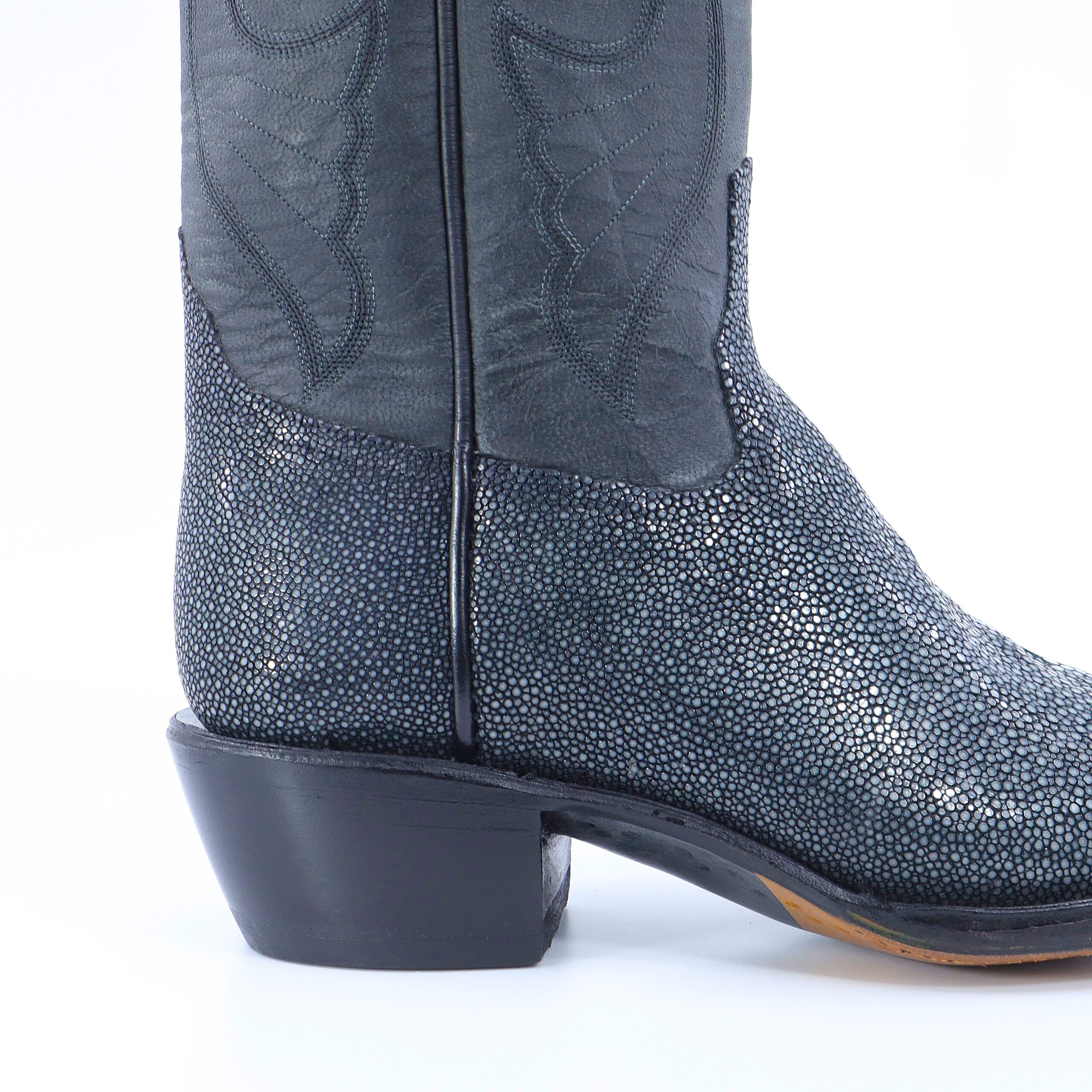 Step into luxury with these 15’inch, South American Stingray boots. Wearing stingray is more than style—it’s prestige you can step into. Stingray radiates sophistication and strength, balancing timeless elegance with durability that outlasts most exotic leathers. The shaft is constructed with Grade-A Premium Goat skin and is complimented with a six-row stitching design and exotic outlay pull-straps featuring personalized initials “K L K.” The premium cushioned insole offers lasting comfort and support. Single stitched welt construction around the leather outsole guarantees durability for extended wear. Lemonwood pegging construction and leather stacked high walking heels. Imported leather soles. Proudly Custom Handmade in Weslaco, Texas.