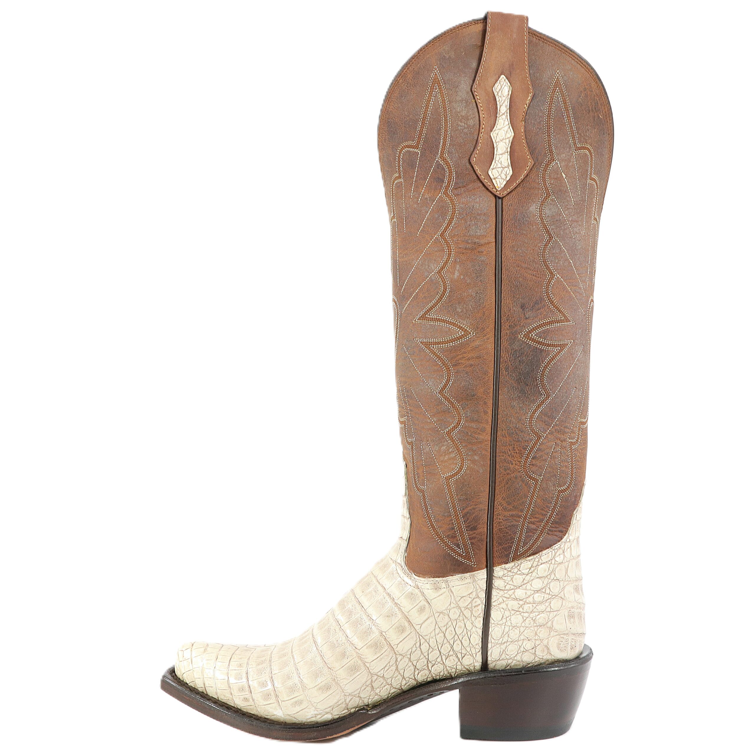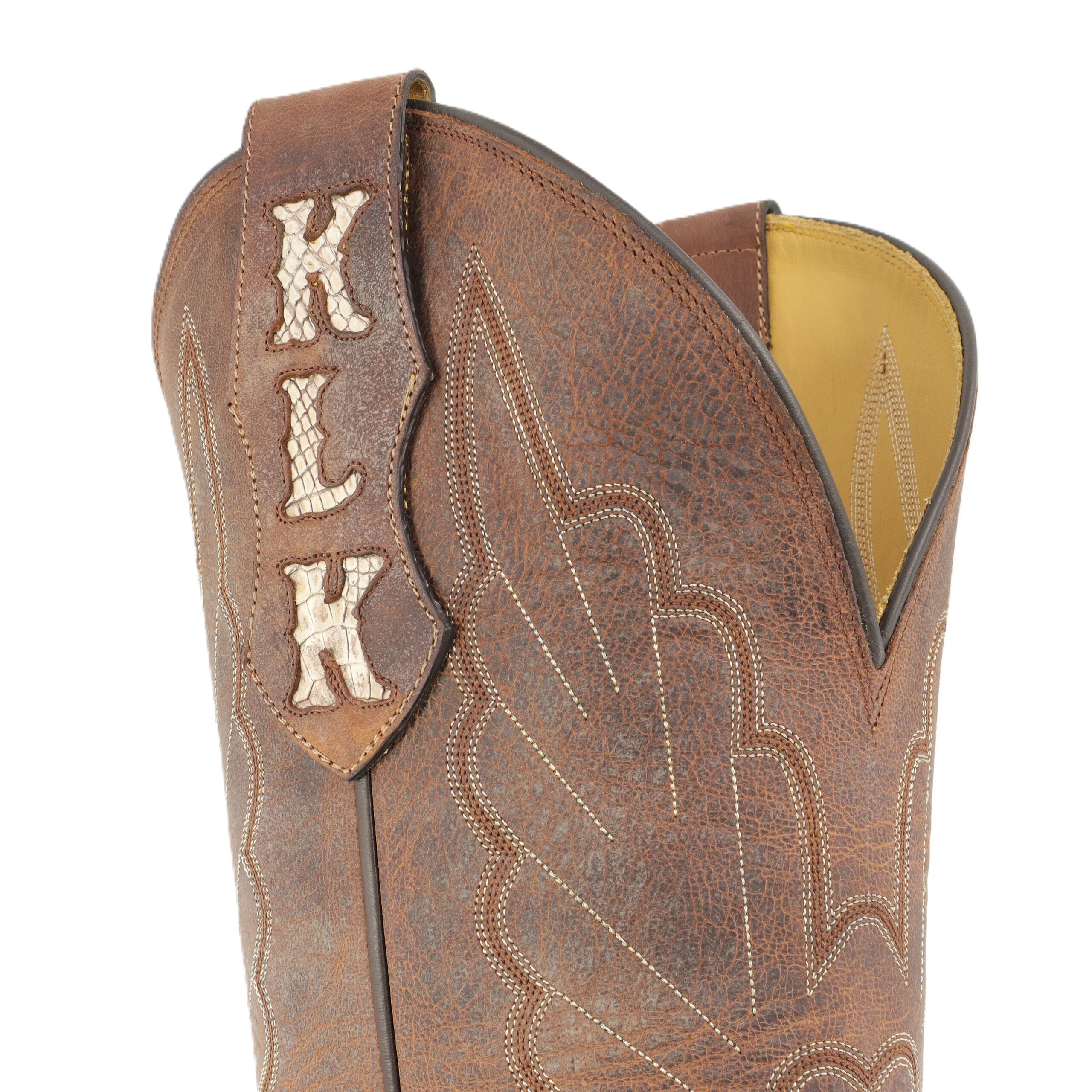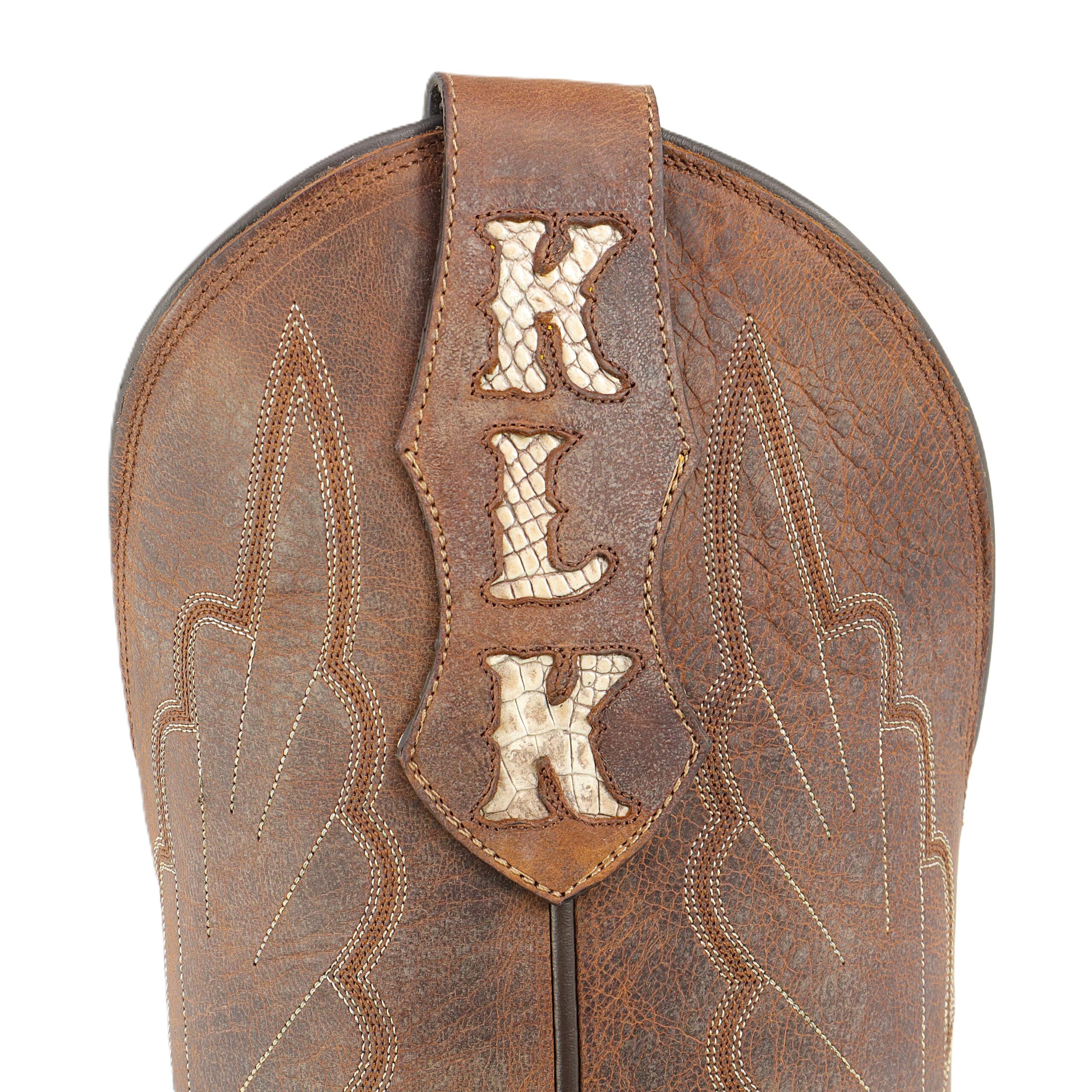 Where exotic meets elegance. Standing 15″ tall, this pair exudes sophistication with its refined, rectangular scale pattern and glossy finish. Bold yet elegant, caiman belly makes a powerful statement for the woman who walks with confidence and style. The shaft is constructed with Grade-A Premium Goat skin and is complimented with exotic outlay pull-straps with personalized initials” K L K.”. The premium cushioned insole offers lasting comfort and support. Single stitched welt construction around the leather outsole guarantees durability for extended wear. Lemonwood pegging construction and leather stacked high walking heels. Imported leather soles. Proudly Custom Handmade in Weslaco, Texas.