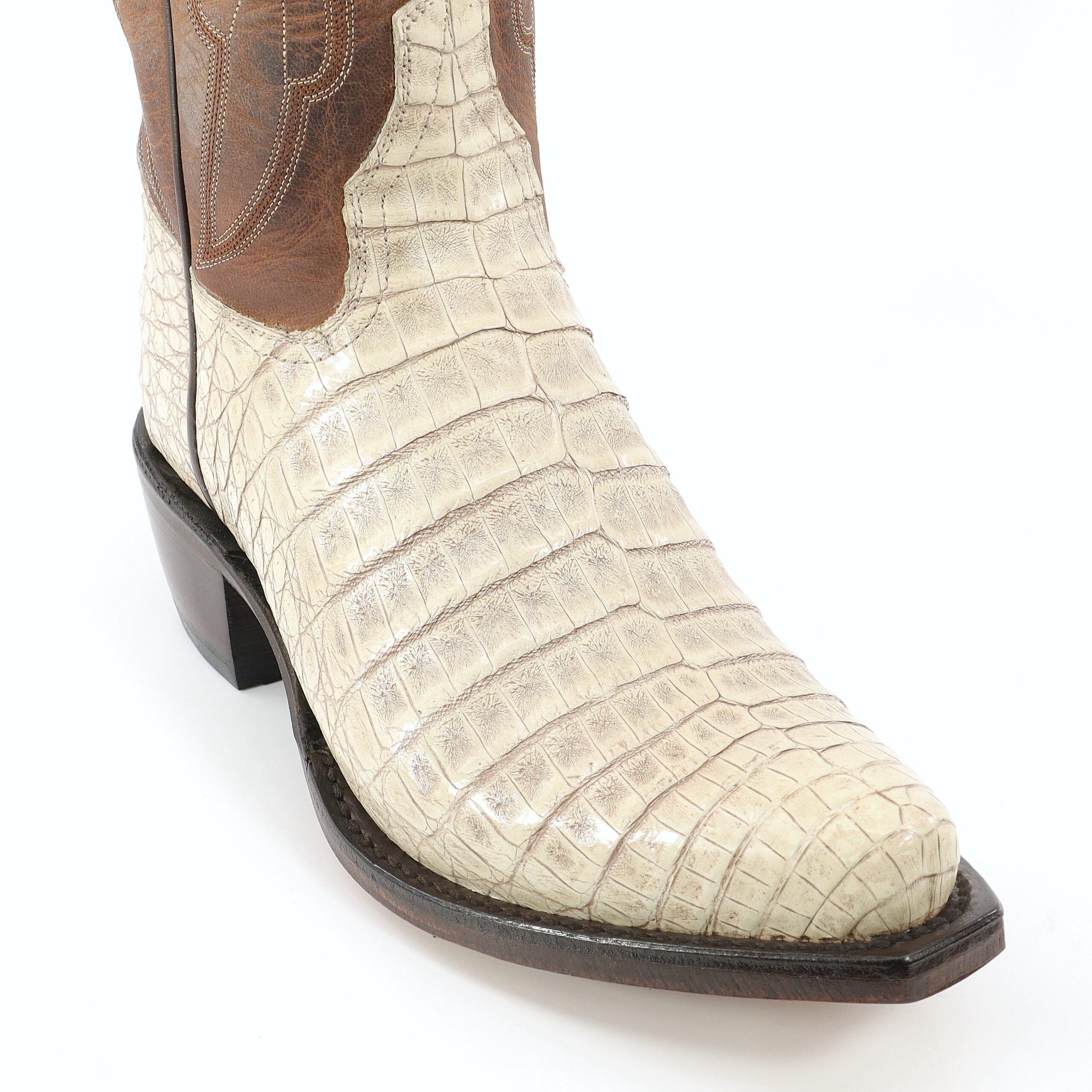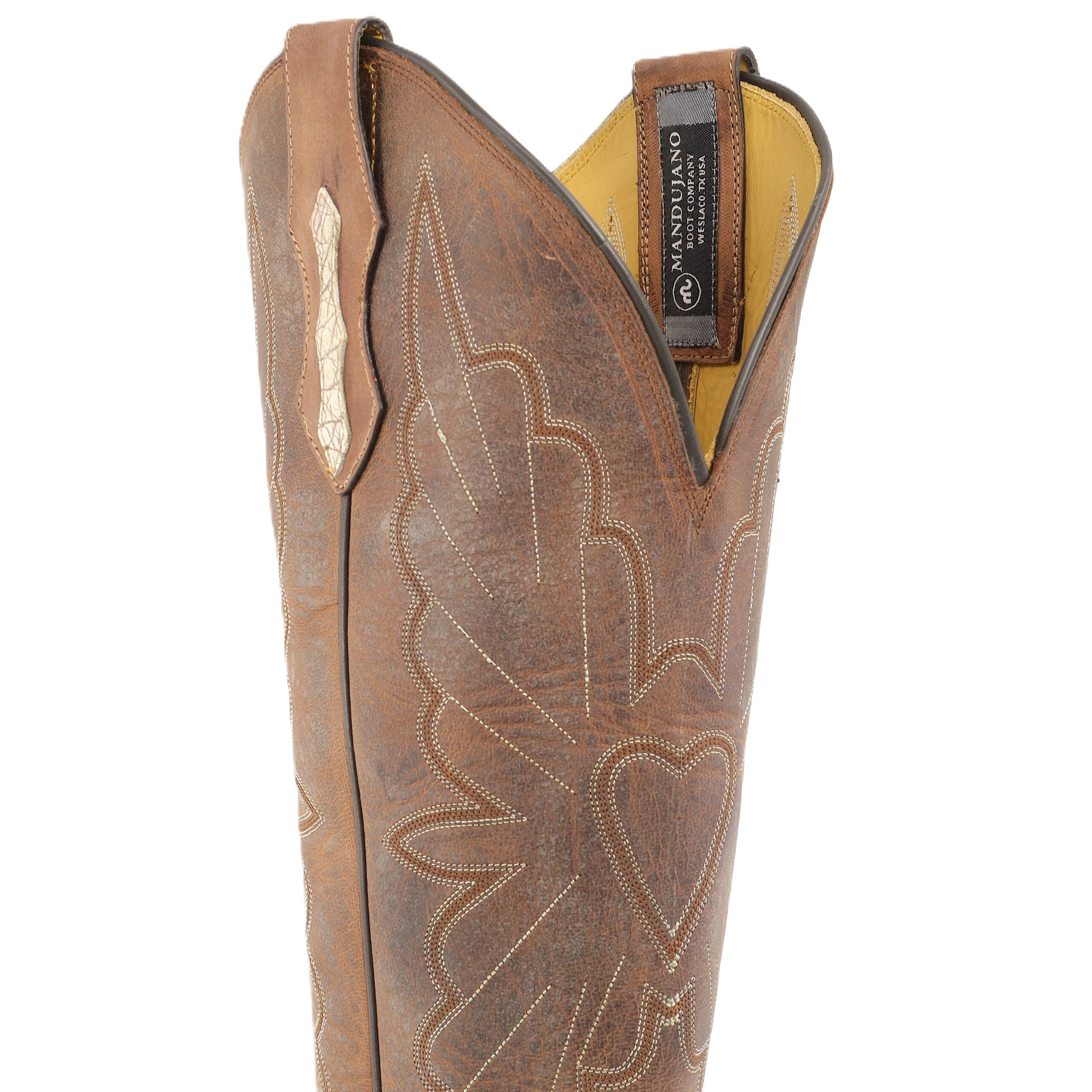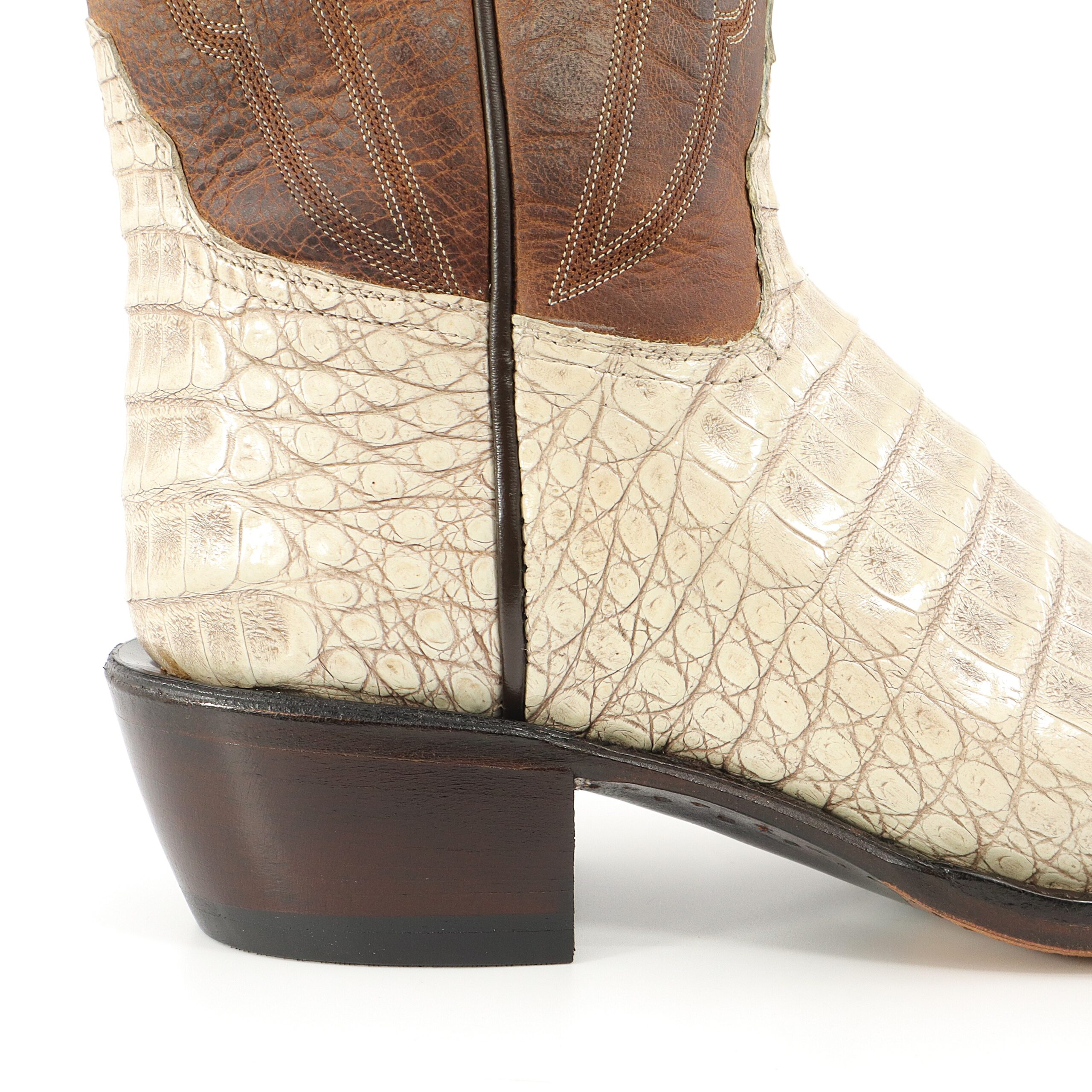Where exotic meets elegance. Standing 15″ tall, this pair exudes sophistication with its refined, rectangular scale pattern and glossy finish. Bold yet elegant, caiman belly makes a powerful statement for the woman who walks with confidence and style. The shaft is constructed with Grade-A Premium Goat skin and is complimented with exotic outlay pull-straps with personalized initials” K L K.”. The premium cushioned insole offers lasting comfort and support. Single stitched welt construction around the leather outsole guarantees durability for extended wear. Lemonwood pegging construction and leather stacked high walking heels. Imported leather soles. Proudly Custom Handmade in Weslaco, Texas.